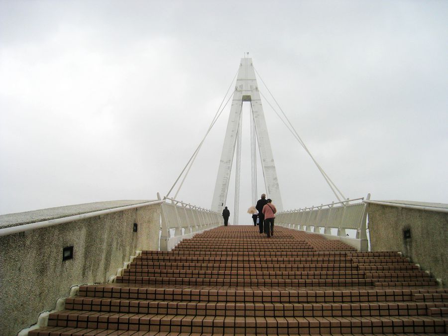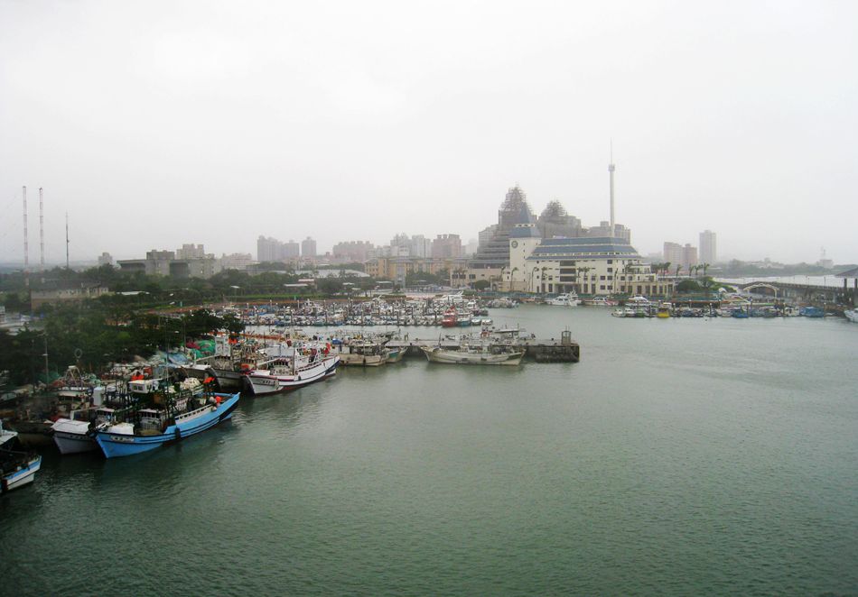离开野柳来到淡水。淡水是台北县的一个小镇,下了车,风夹雨飘然而至,冒雨登上淡水情人桥,导游说,情人桥因在情人节开通而得名。桥头有陈水扁题写的“情人桥”三字。透过雨帘远眺,桥两边是渔人码头,可能为了避风,港湾停满了渔船,那高大的船桅在风中抖动着,显得有些寂寥。码头岸边,小吃店、酒吧、咖啡馆鳞次栉。情人桥很壮观,全桥呈白色,桥面由白紫地砖铺路,非常漂亮。游客纷纷登桥留影。