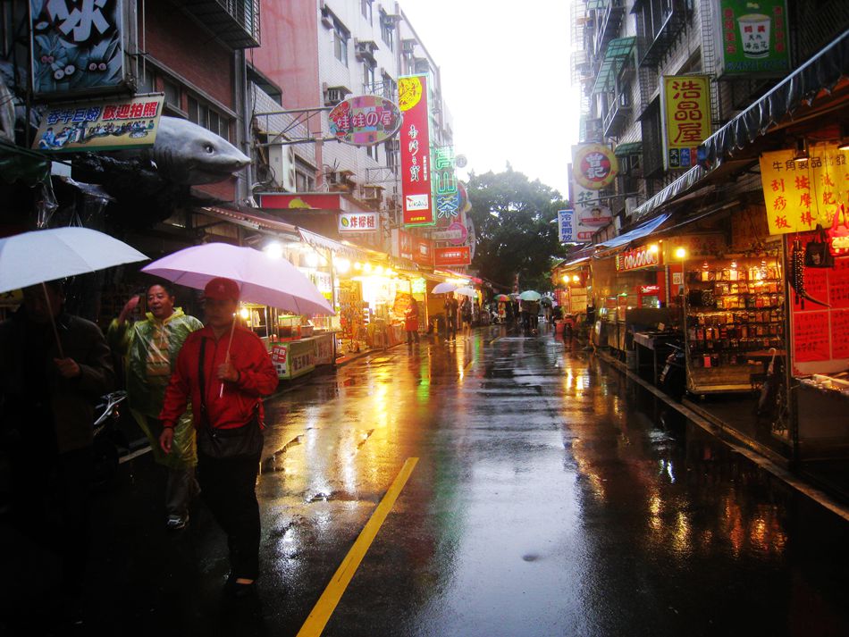 桥下是淡水老街,虽说下着雨,但游人仍然不少,且大都是游客。老街两旁店铺密集,商品繁多。食品小吃店一字排开,飘荡着诱人的香气。淡水老街不算长,比较狭窄,但却整洁干净,店铺光可鉴人。打着伞,徜徉在淡水老街上,丝毫没有陌生感,一样的风土人情,一样的中国话,如家乡老街一样让人感到亲切。