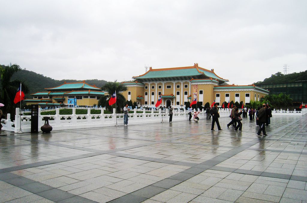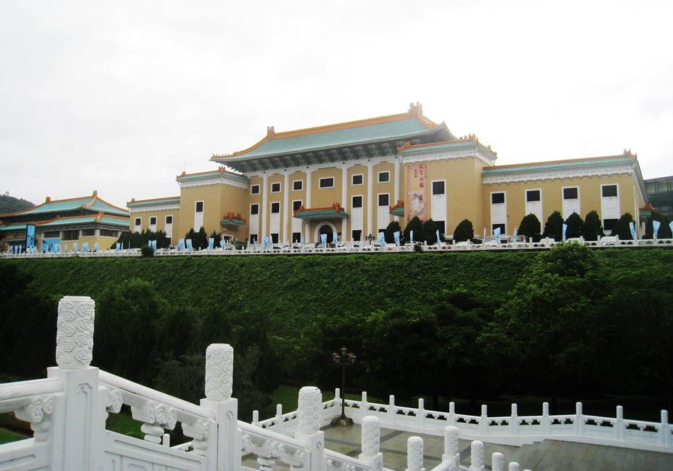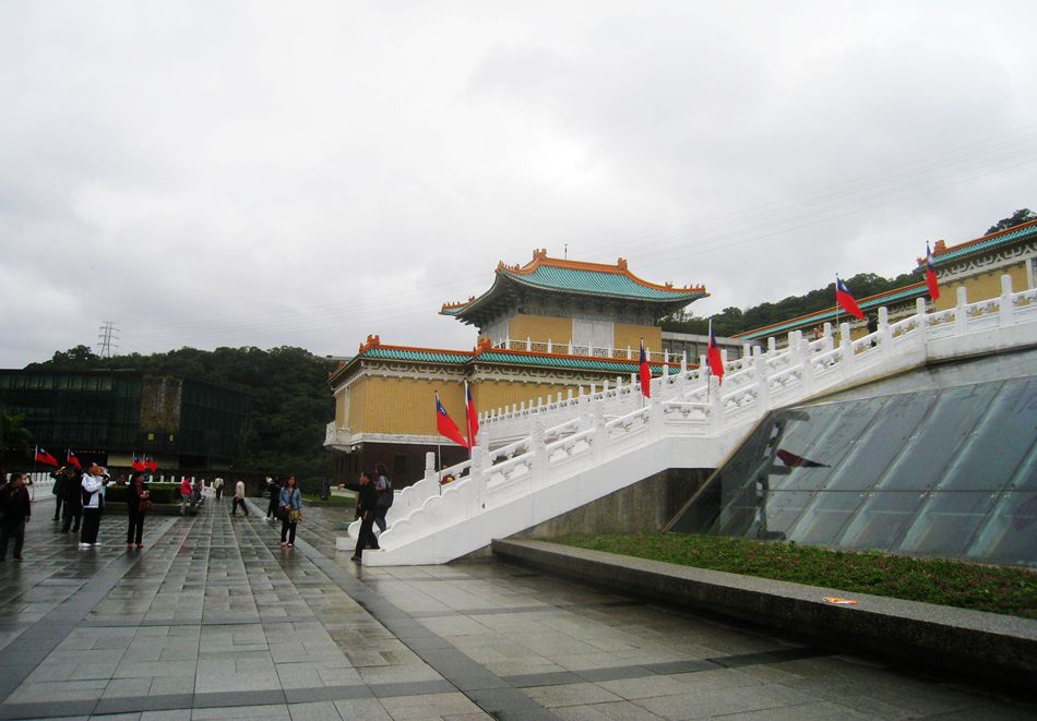 第二天早上到台北故宫博物馆参观。这天,台北天气阴有小雨,博物馆门前聚集了大批游客。博物馆建筑宏伟,淡蓝色的琉璃瓦屋顶覆盖着米黄色墙壁,洁白的白石栏杆环绕在青石基台之上,风格清丽典雅,是个山青水秀的地方。广场上挂着国民党旗,那红蓝白三色旗子在风雨中飘扬,给庄严的博物馆添了些许灵动。开馆时间到了,游人排成长队,按序参观。