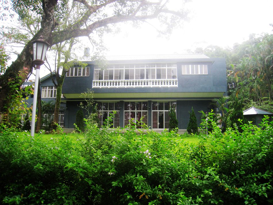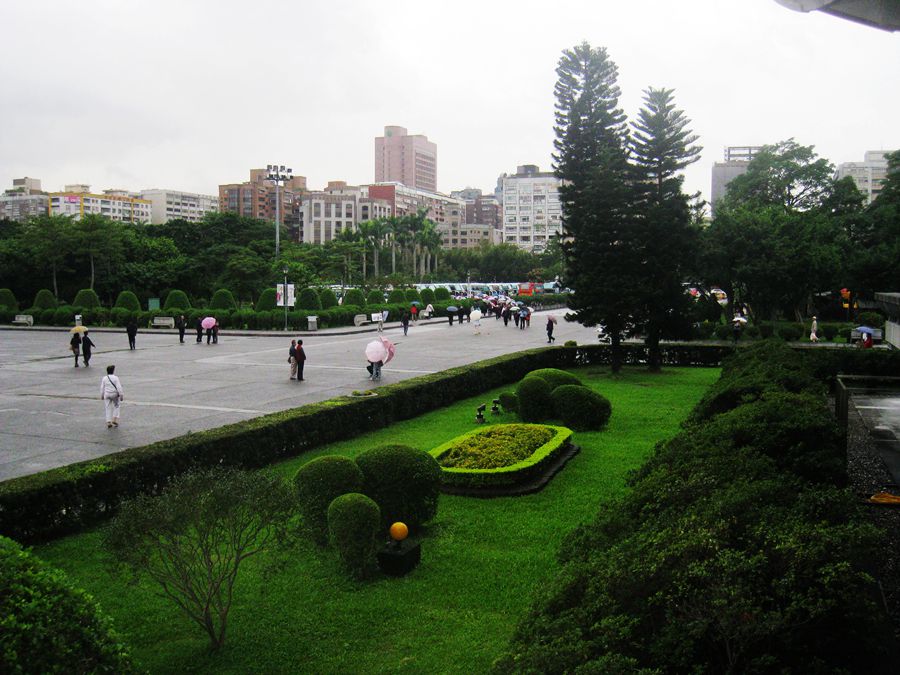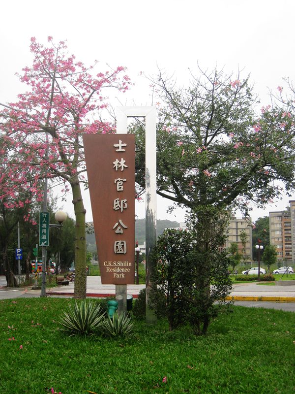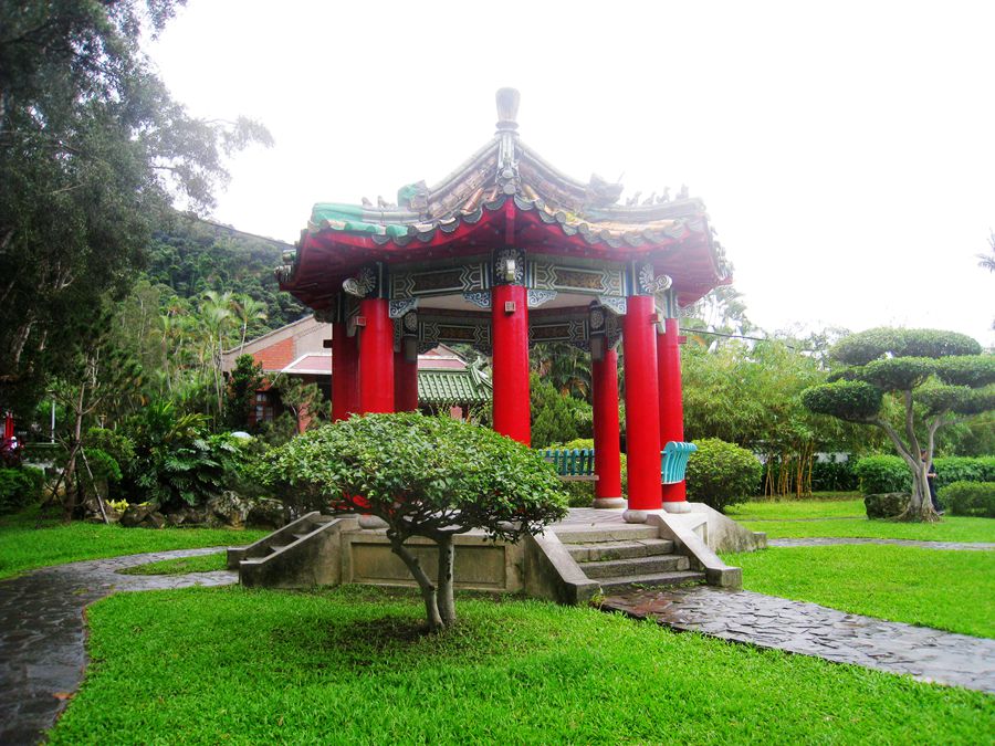 台北第三天,我们来参观蒋介石、宋美龄居住的士林官邸。这天依然小雨飘洒。望着密林中的深绿色小楼,蒋介石在这里度过了二十六年的光阴,这个曾经显赫的人物,蜗居在这个两层水泥的楼房里,心中肯定是不甘和孤寂的。房子被紧锁着,门上挂着一个牌子,上书总统府。房子正在维修,暂不开放。游客只好到院子花园里参观。这座园林真大,郁郁葱葱,绿化的真好,到处都是花草树木,还有喷泉、假山假石。特别引人注目的是公园里有一座红色的凉亭,听说这是为宋美龄建造的。导游介绍,这里的园林建筑有特点,欧式的,中式的都有。完全是蒋介石喜欢中式,夫人喜欢西式所致。