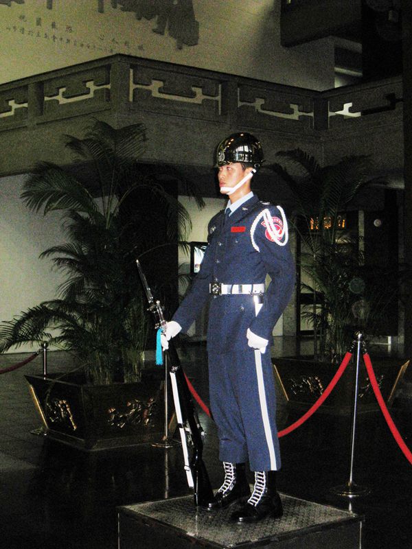 游完故宫博物馆又马不停蹄的来到国父纪念馆。这座建筑是为孙中山而建的,巍峨壮观。馆外有中山公园,有九曲桥、池塘、假山、柳树等点缀。馆内,孙中山巨幅雕塑端坐大厅中央,两个仪仗队员,身穿制服,带着白手套,手握钢枪,笔直的站在雕像两边,庄严的神情被疑为是假人。从国父纪念馆出来,站在台阶上眺望,既能看到台北著名的101大楼,尖尖的塔尖钻入云宵。广场上喷泉飞涌,乐曲悠扬。随着音乐的起伏,水柱高低不平喷洒。是夜,下榻台北麒麟饭店。