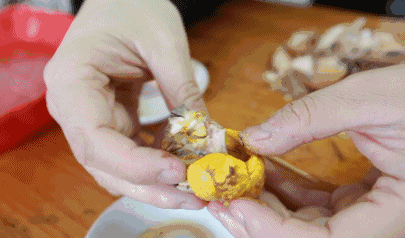 小竹签从沙虫中间穿过,内脏和杂质便没有了。然后薄薄地涂上一层蛋清,裹上一层生粉。下锅油炸,直到沙虫金黄。咬一口香脆带甜,鲜到眉毛都快掉了。