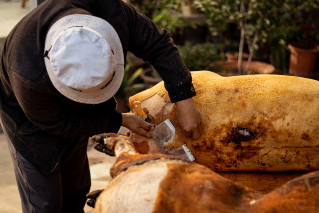 据说在各种烧法中,口感最好的是用稻草火烧猪皮。当猪被烧得金黄、焦香,最好的生皮就在前胛、肚底的位置,还有猪耳、猪嘴。