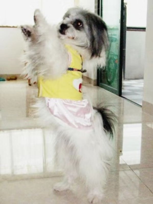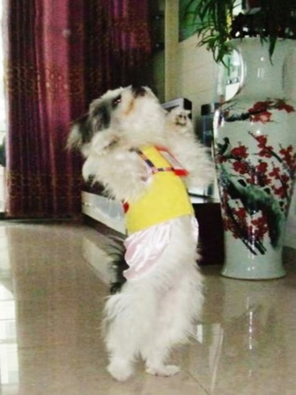 于是我们就在网上找呀啊,搜呀!我只有一个条件那就是要真正喜欢狗的人,不要像我是被感动后才喜欢狗狗的。上网一看还真有很多想收养狗狗的人,动不动就先亮出给“利是”的数目,这些是老广的习惯,但是我们是不会为这个所动。有一天总于发现了一位比较合适,因为他表诉喜欢狗的程度非同一般!他说:”我太喜欢狗了,不但因为我属狗,我还要找和我一样属狗的老婆,找到了属狗的老婆后,我们俩等到狗年才生了一个同样属狗的”狗”宝宝,可见我们一家人是多么的爱狗!我眼前一亮,就是这家人了!不行还得问问他是哪里人?回答是,四川的,好!再冒昧的问一下先生你是什么职业?开馆子的。心想太好了,路路小东西饿不着,终于给小东西找到了一个比较放心的人家。选了一个风和日丽、阳光灿烂的日子,我把小路路打扮的漂漂亮亮,带上了它平时喜欢吃的香肠,零食,玩具等等,像出嫁闺女一样开车把它送到了这家开馆子店人家,他们一眼就喜欢上了它。后面的日子里我们经常带上煮好的排骨,鸡腿等开车去看小东西,每次去他们都要我们等一下,原来是要给小东西打扮一番才让我们见面,看得出一定是临时慌手忙脚,穿上的花衣服,是要做给我们看,让我们放心吧!