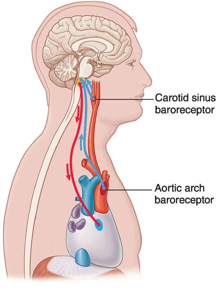 这些感受器会感受我们脖子动脉中的血压,当血压过高时,感受器会将血压信息传送给迷走神经,迷走神经将信号再传给心脏,这时候,心脏就会开始调节心率,使得心率减慢,动脉血压下降。而当血压过低时,心脏的输出量就会增加,让动脉的血压回升。