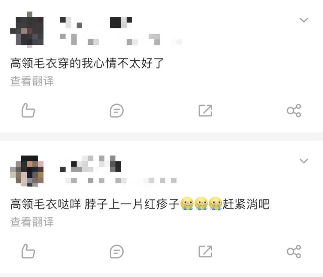 在网上随便一搜,就能看到不少高领毛衣“害人”事件。显得脖子短脸圆就算了,更严重的可能是会让脖子发痒,勒得人难受甚至胸闷。
