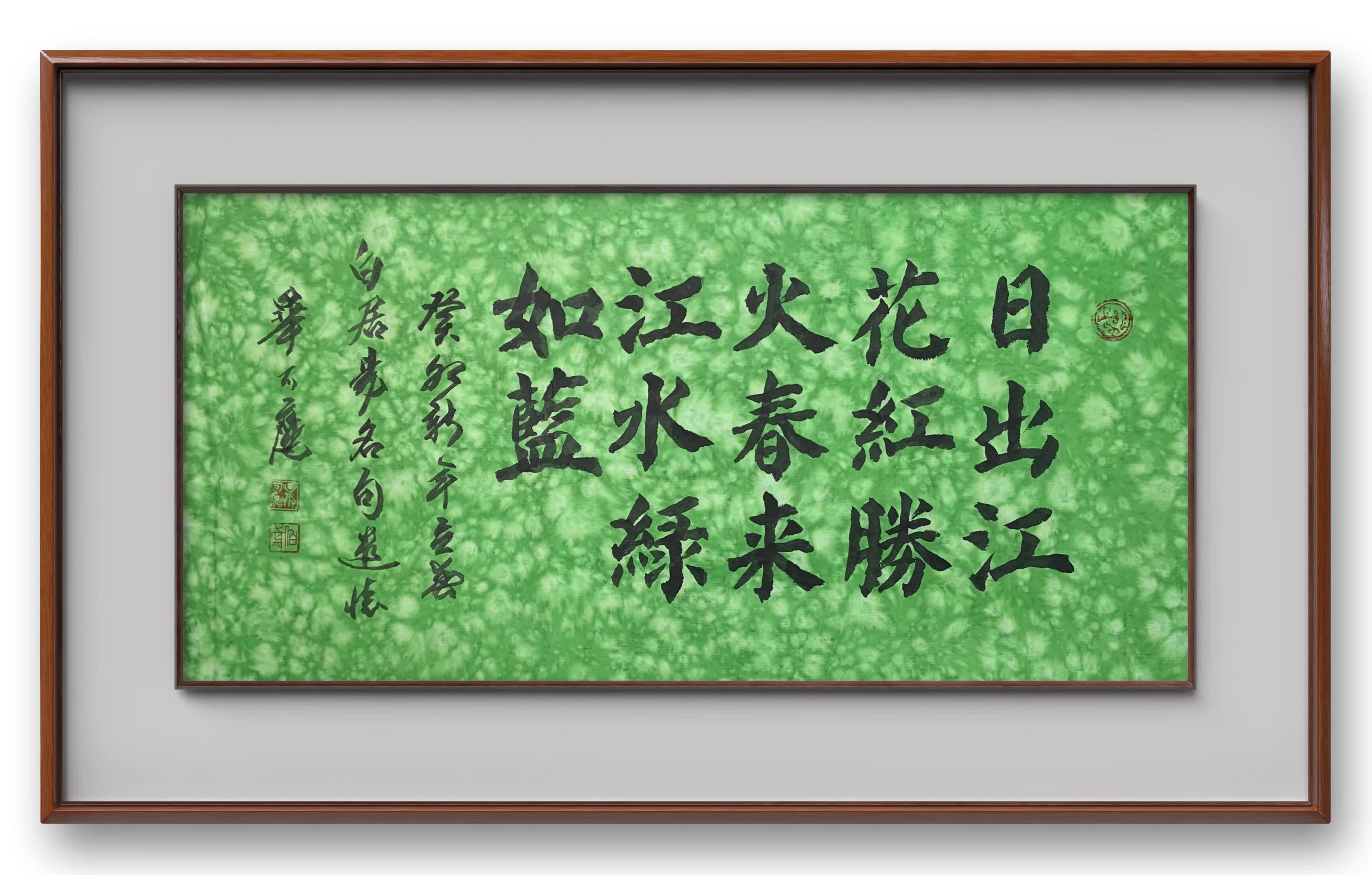 早课:绿色虎皮宣纸上楷书唐 . 白居易词句: