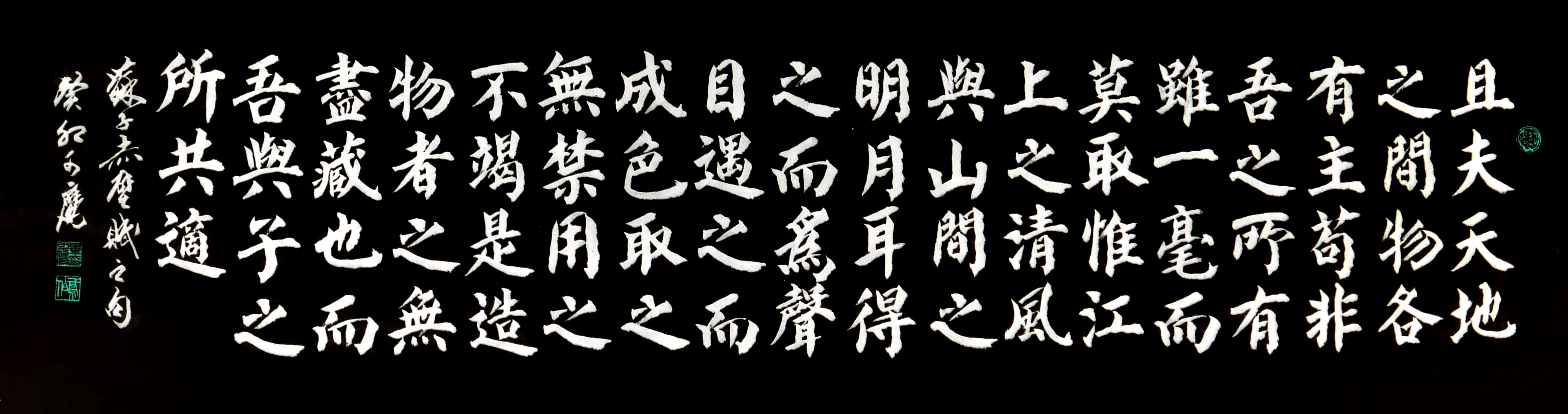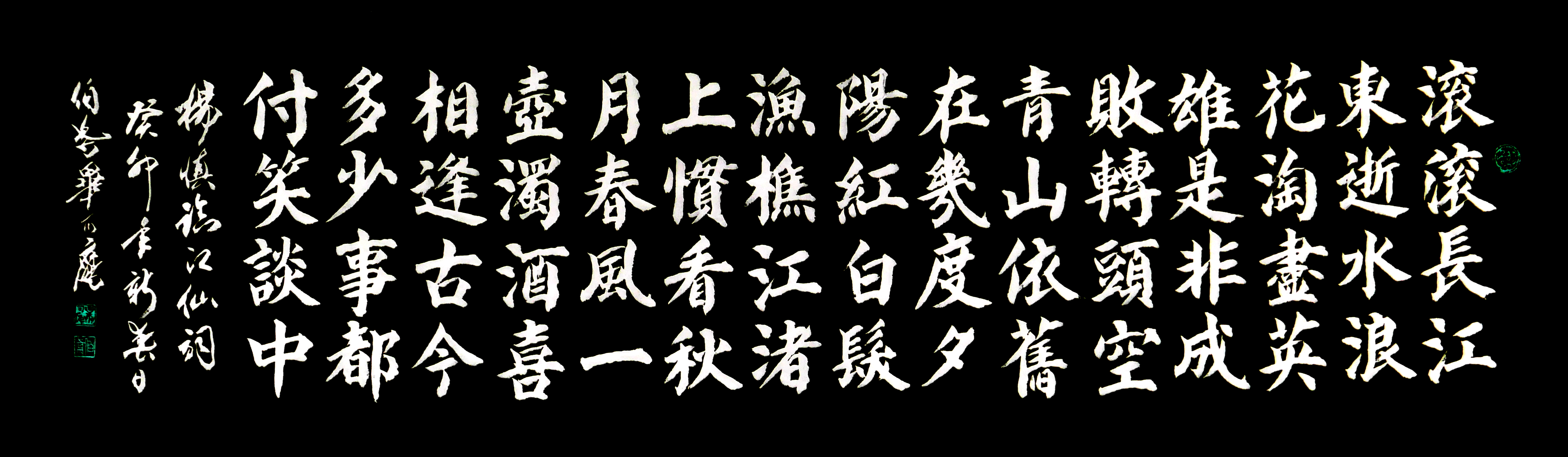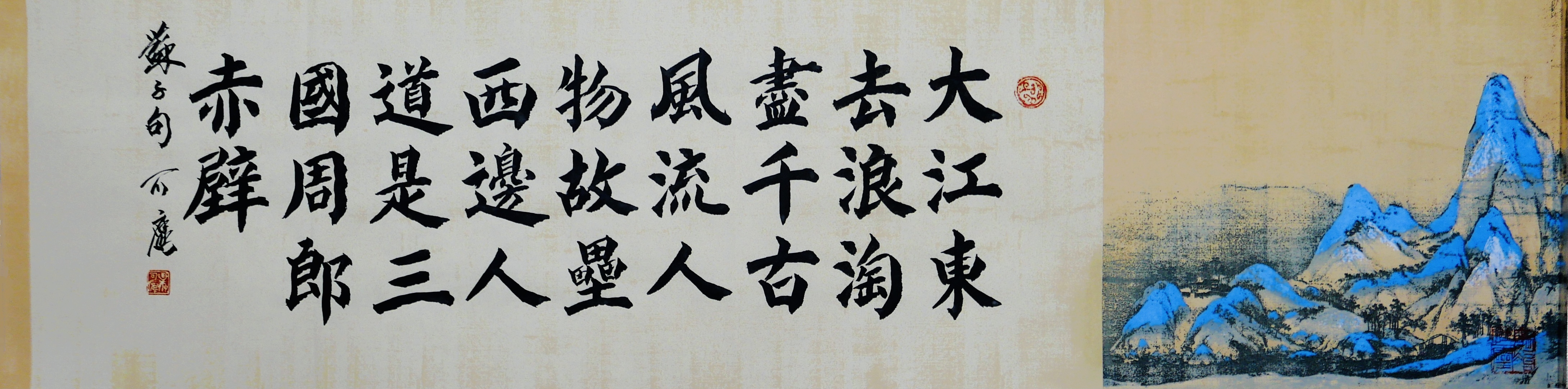 今天在北宋画家王希孟的山水画卷上书写宋 . 苏轼的《念奴娇•赤壁怀古》之句: 江山如画,一时多少豪杰!