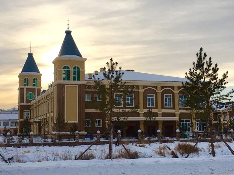 到漠河县城后,经过一个非常漂亮的中学,随手拍了几张照片留念,因为太专注,一脚陷进了厚厚的的雪堆里。