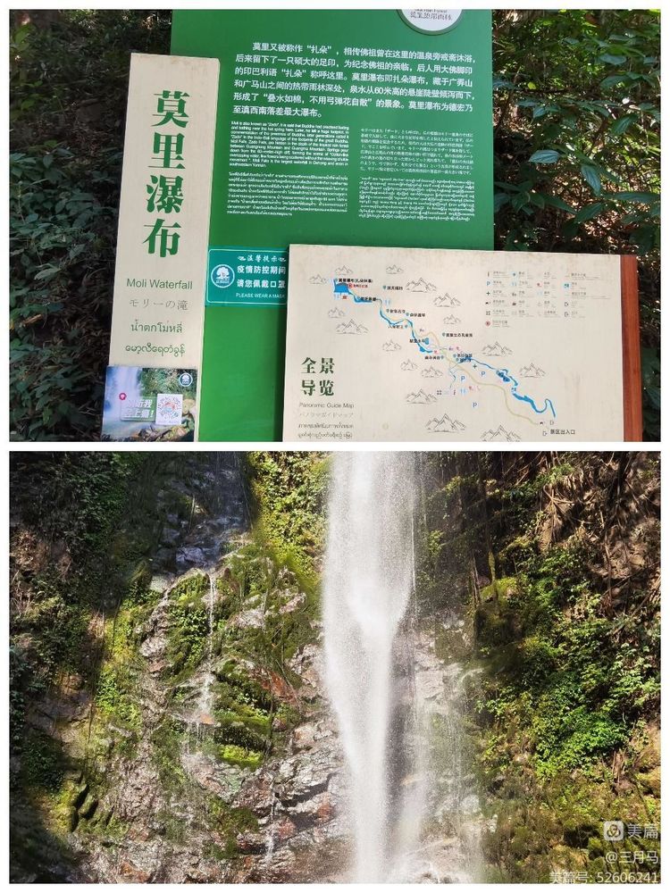 莫里瀑布又称扎朵瀑布,位于芒市、陇川、瑞丽三县市结合部的莫里热带雨林的峡谷中。瀑布清澈的泉水从60米高悬崖陡壁倾泻而下,形成“叠水如棉,不用弓弹花自散”景象,似一匹巨幅白绸在空中迎风飞舞,高峰悬崖间雪飞云涌,响声如雷鸣,瀑布下又有温泉涌出,景观十分奇特。