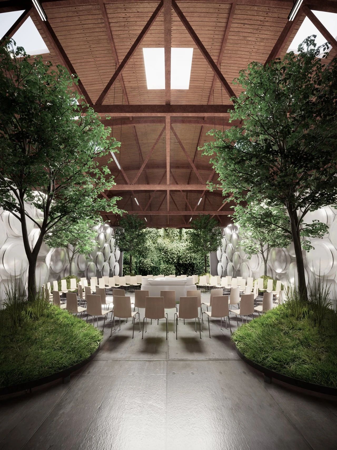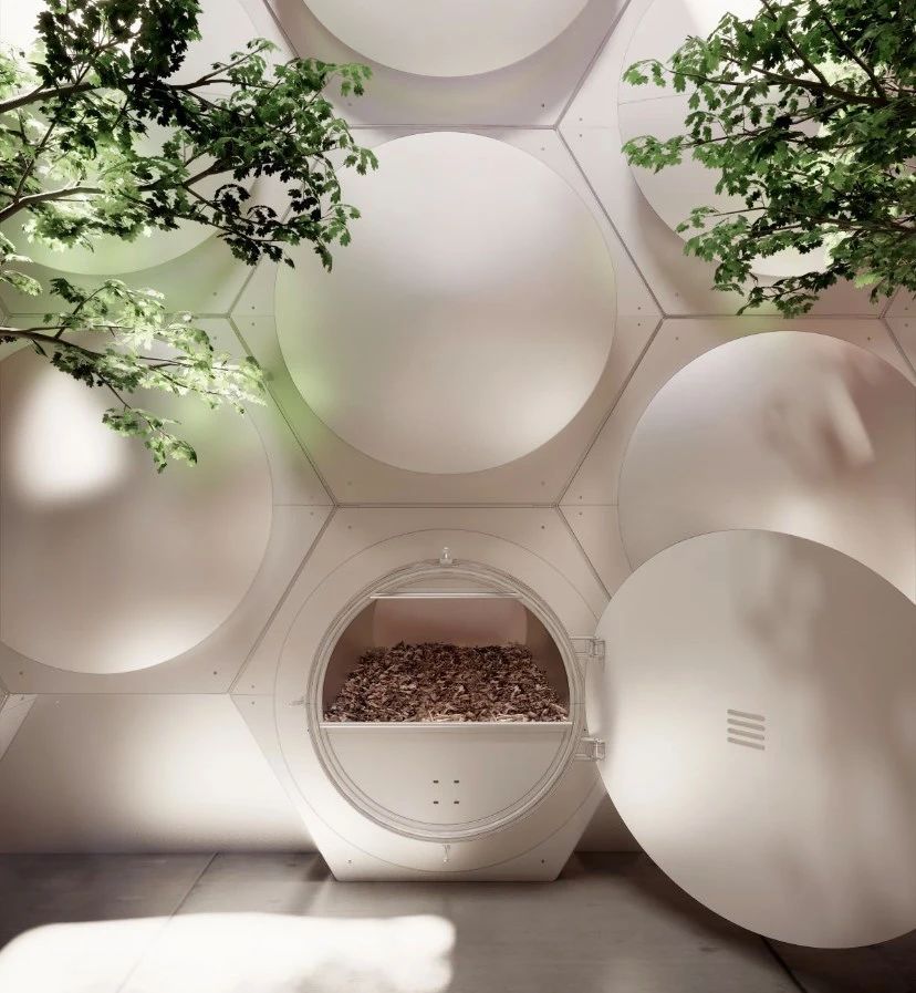 全球第一家把遗体变成泥土的殡仪馆Recompose位于美国西雅图,室内绿植环绕,有54个白色不锈钢堆肥容器,视觉感明亮温馨。在葬礼开始时,遗体被包裹着,放在一个被木屑、紫花苜蓿和稻草包围的容器中。