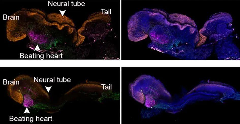 实验中,研究人员将小鼠基础的胚胎干细胞系和基因改造后的胚胎干细胞系在培养皿中一起培养了5天,随后转移到了旋转的培养容器中。在培养的第8天时,细胞形成的类胚状体组织非常类似于自然情况下发育8.5天的胚胎:拥有跳动的心脏、清晰的头尾末端,且形成骨骼肌的块状体节和发育中的大脑和脊髓,以及其他器官的雏形。研究人员还测量了其中4万多个胚胎细胞的基因活性,发现预期的所有类型的细胞都在正确的位置。