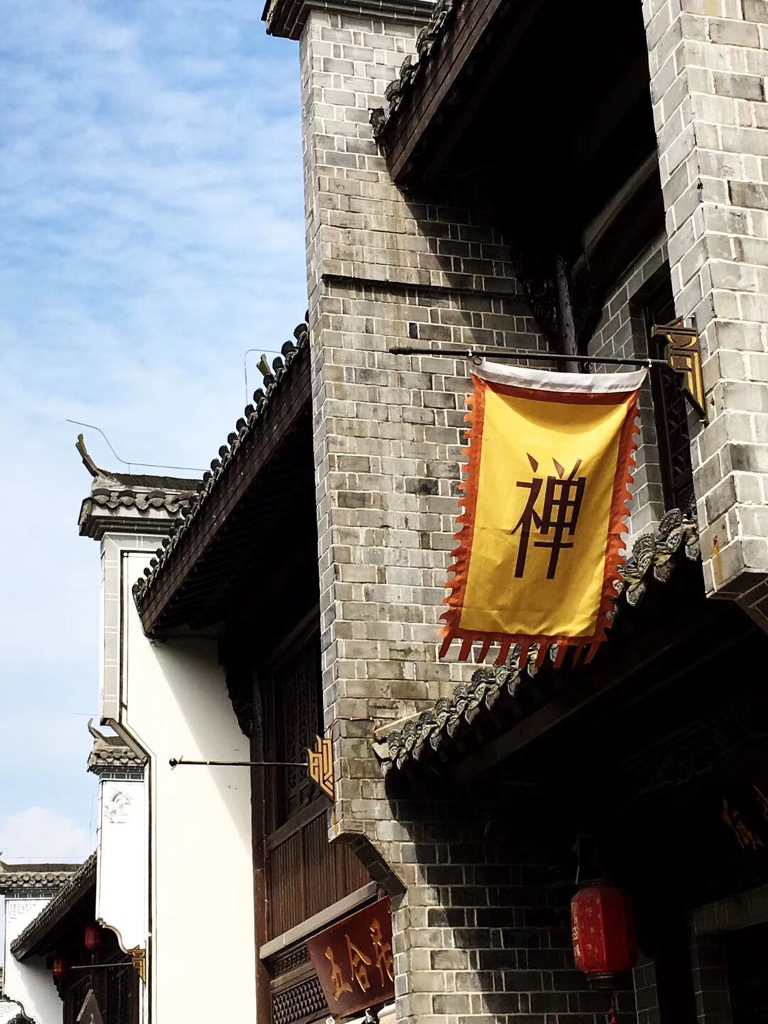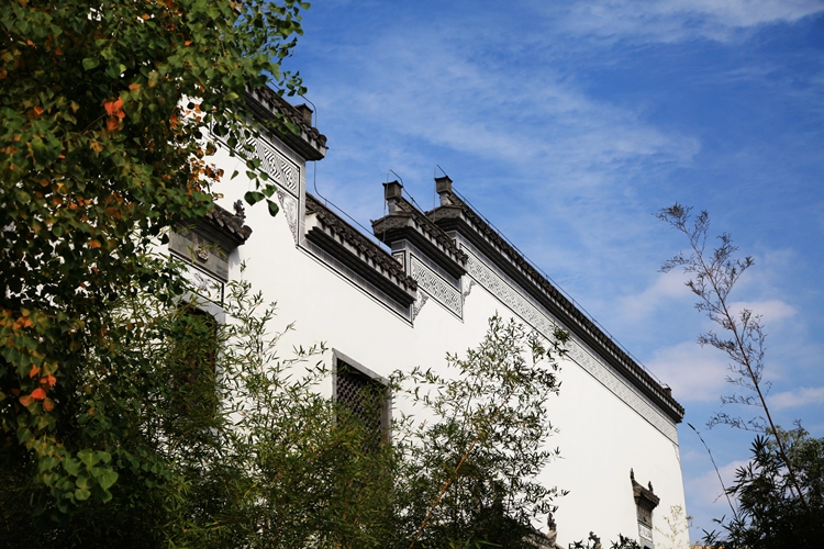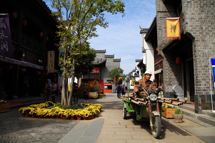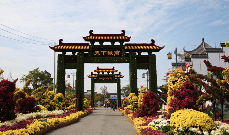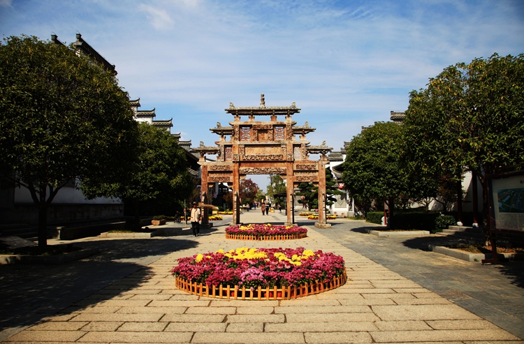 走进鸠兹古镇,果然不负所望,给了我大大的惊喜。街两旁摆满了鲜花,蓝天白云下,高耸两座巍峨的大牌坊,前面一座写着“天下徽商”,后面一座写着“兴于鸠兹”。走进古镇,粉墙黛瓦鳞次栉比,沉淀传奇般的徽文化基因。细观这些房屋,大都是仿古,但建造精细,尽显徽派建筑本色。一路一巷,一院一景,房檐粉墙,各具特色,非常漂亮。这里除了徽派建筑和古老的牌坊,还有各种文化会馆,名人故居等。置身于此,好象走入了一幅水墨写意,婉约极致的徽韵画卷。真是让人爱了,爱了。