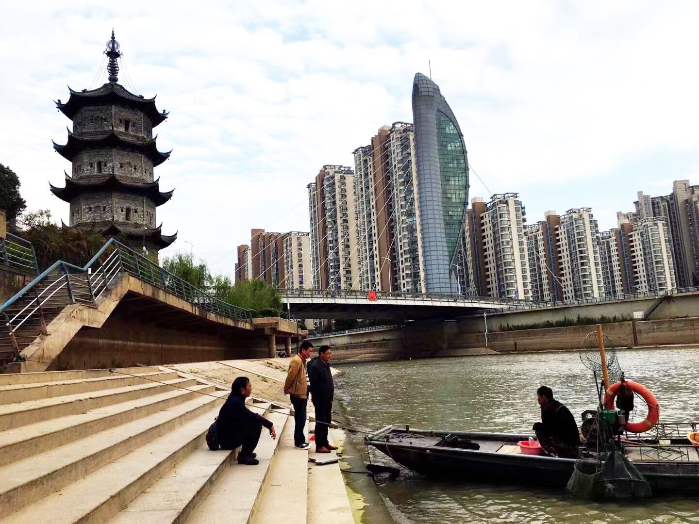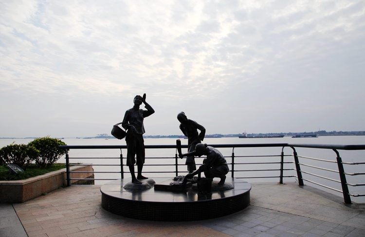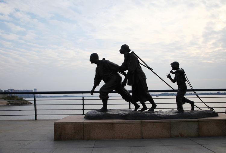 沿着江边徜徉,既见一座古塔,路边有一大牌子写着“中江塔”三个大字。绕塔而行,古朴气息扑面而来。抬头仰望,塔尖有风铃,徐风吹来,铃声叮当响,甚是悦耳。这座塔历史悠久,是芜湖地标建筑。不远处还有老海关、太古码头、天主教堂等人文景观,显示着这座城市丰厚的文化底蕴和内涵。在江边还有许多雕塑也值得欣赏。尤其一家三口的网红雕塑很有名气,一对父母和小孩拉着纤。所以也叫“纤夫”。它直观的反映长江水位的涨落变化。