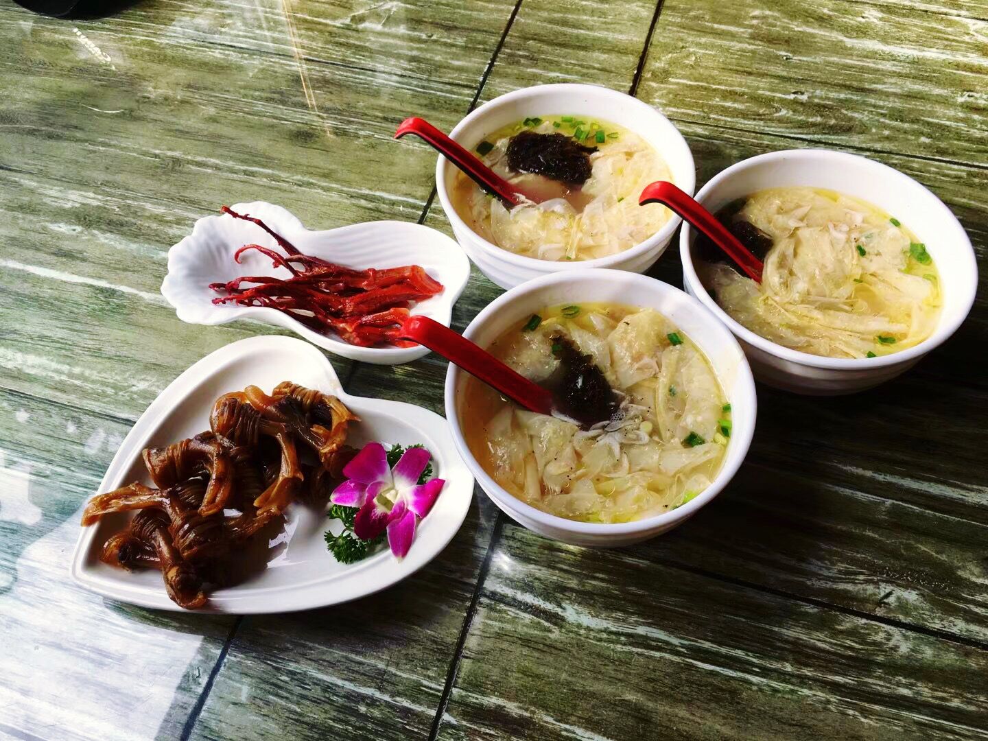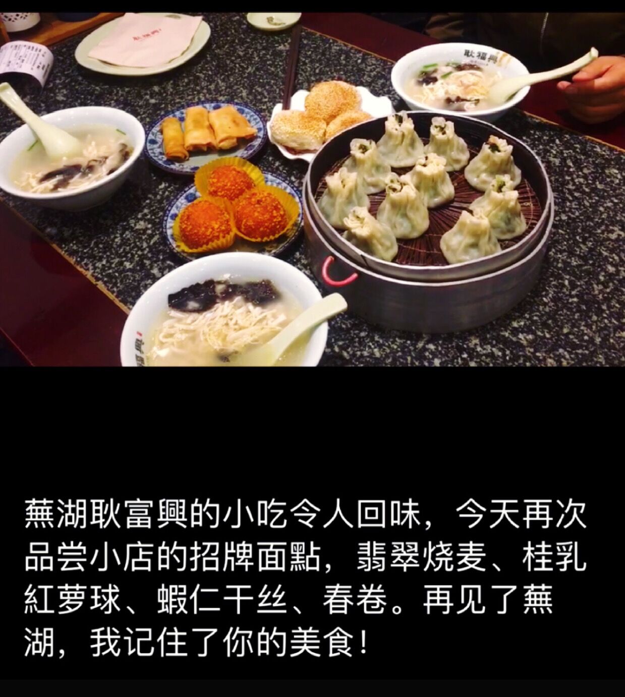 看了菜单才知道,这家店美食超多,一次品尝不完。我们先点了虾籽面、灌汤包、桂花饼三样。虾籽面是芜湖传统小吃,属徽菜系。该面是当地市民最喜爱的美食。听说还入选了安徽省非物质文化遗产。能够品尝非物质文化遗产,也算有口福了。虾籽面确实很好吃,面有韧性,味道鲜美,令人回味。灌汤包我却觉着口感一般般,而桂花烧饼则酥脆爽口,有淡淡的桂花清香。 因为一次没吃够,离开芜湖前,我们又来吃了一次招牌面点:翡翠烧麦、桂乳萝球、虾仁干丝、春卷等美食。