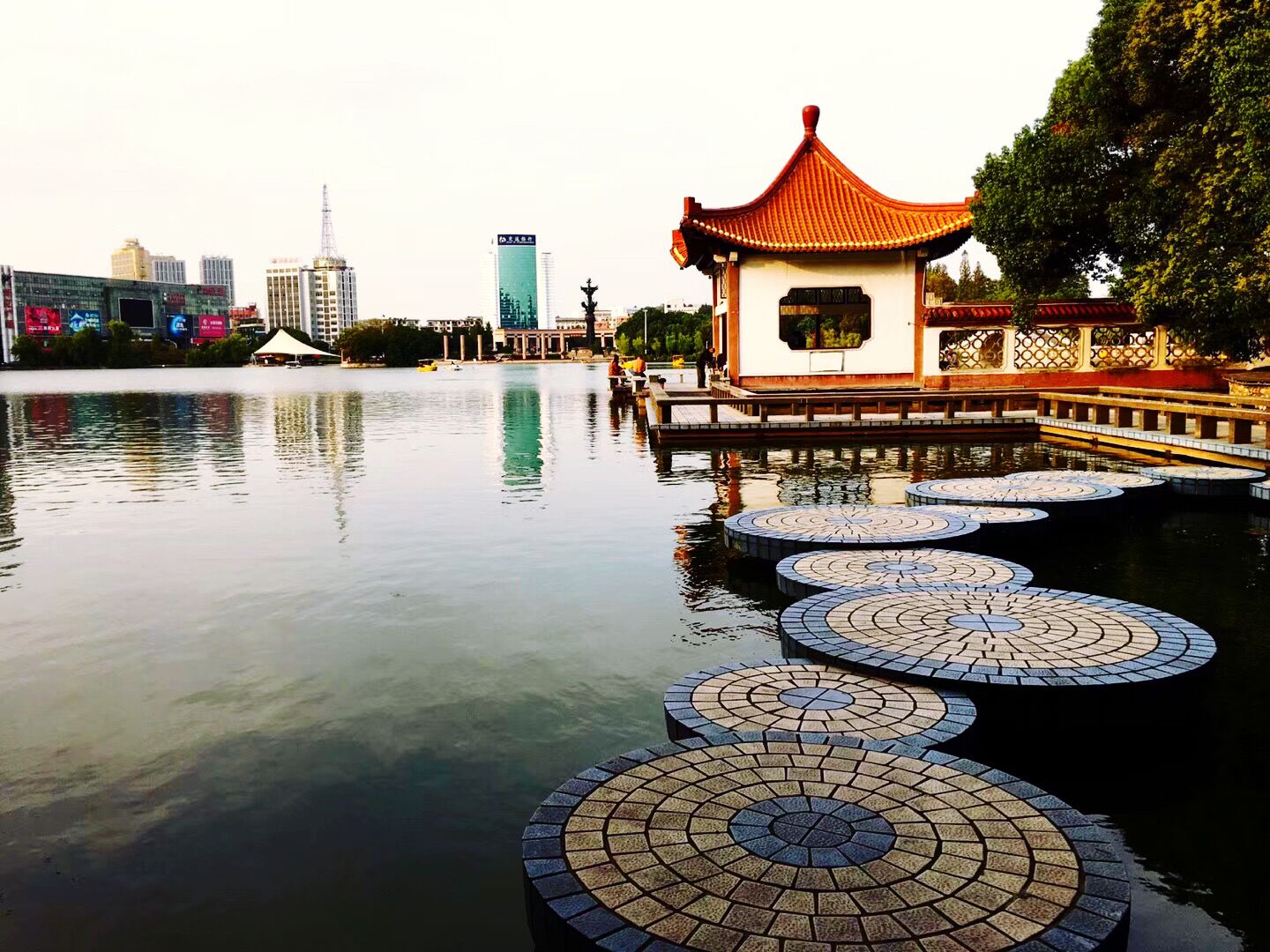 芜湖的镜湖公园位于市区,毗邻繁华的中山路步行街。湖水洁净,明亮,象一面大镜子,映出两岸的风景,非常漂亮。湖中亭台楼阁,曲桥长廊相通,岸边高楼大厦环湖矗立,平添出浓郁的都市情调。湖中有一条路可走,还有游船可玩。我们沿着湖中的路走到亭台楼阁,这里有一扇古色古香的花格窗,透过窗子能看见鸬鹚广场跳舞的人。这时天空飘起小雨,让人有点不尽兴。沿着湖边徜徉还看到了安徽师范大学,这座大学我早就有耳闻,因为女儿的闺蜜小云曾在这里读书。站在大学校门前,我有点怅然若失。我不知小云现在何方?