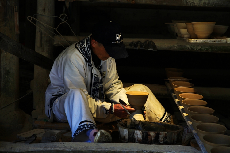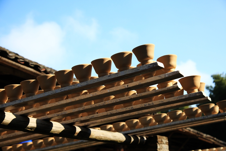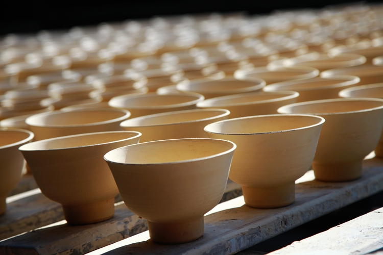当我们穿过瓷碑长廊,来了手工制瓷坊前停下了脚步,那些加工好的泥料,或成品或半成品,白如玉,明如镜,薄如纸,声如罄,摆在货架上,堆在地上,在蓝天的映照下,美仑美奂。作坊里有几个工人师傅正在操作,一块块的泥巴在他们手中变成了一件件精美的艺术品,看的我们入了迷。可别小瞧这些人,随便拉出一位都是国家级的艺术大师。泥巴在他们的手里赋予了美感,从泥土里绽放出生命。