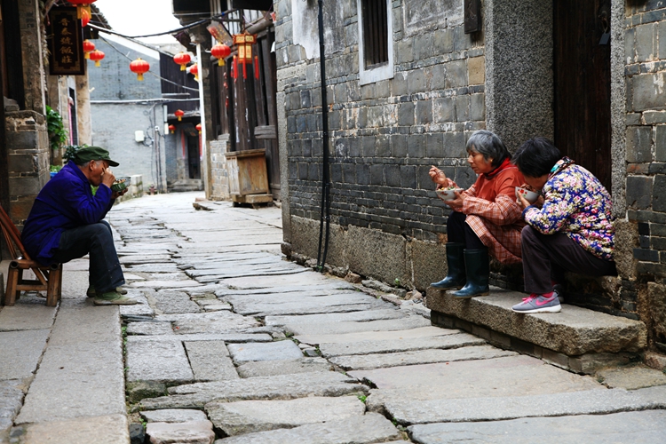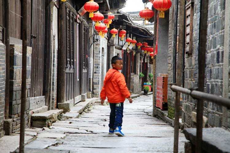 告别村妇走进村子,仿佛置身于一幅千年的历史画卷中。只见青石板铺就的长巷,飘散着古村淡淡的烟火,石板路面看起来古朴沧桑,仔细看还有古时留下的车辙。古村是由三个自然村组成的,距今已有一千多年的历史,漫步古村,古屋错落有致,古井、古牌坊,砖石大门,古戏台、砖雕、石刻、木雕、处处古意盎然,还有蹲在门口吃饭的村民,奔跑的儿童,小鸡咕咕叫着,小狗汪汪嗅着,一派乡土气息扑面而来,让人恍若进入了桃花源里。