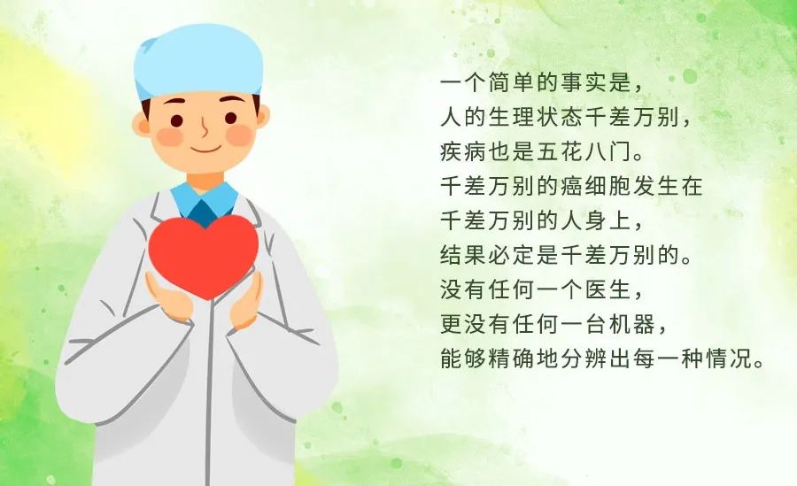 一个简单的事实是,人的生理状态千差万别,疾病也是五花八门。千差万别的癌细胞发生在千差万别的人身上,结果必定是千差万别的。没有任何一个医生,更没有任何一台机器,能够精确地分辨出每一种情况。