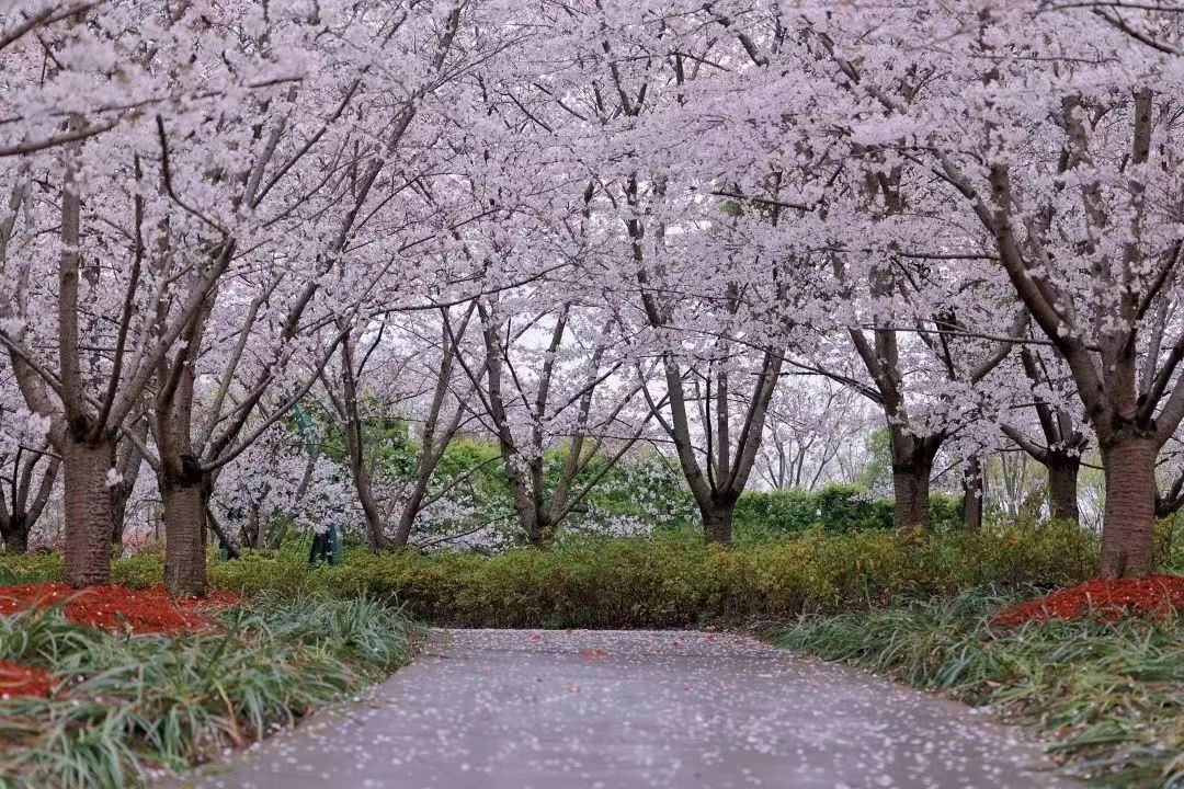我走累了坐在樱花大道的椅子上,但忍不住又仔仔细细观赏樱花树,只见樱花树的花朵在轻慢起舞,在笑逐颜开,在微风里柔水似情……