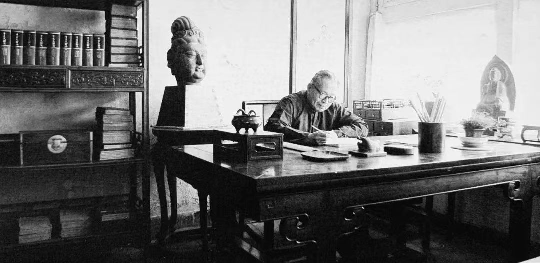 王世襄于其明紫檀插肩榫大画案前伏案写作