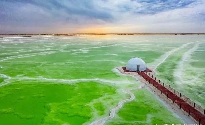 盐湖由于深浅不一、所含矿物质不同,在阳光照射下呈现蓝、绿、黄等不同色彩,且随日照的角度不同而变化。从空中俯瞰,犹如一块块大小不一的翡翠、玛瑙洒落人间,又如瑰丽的宝石镜面。