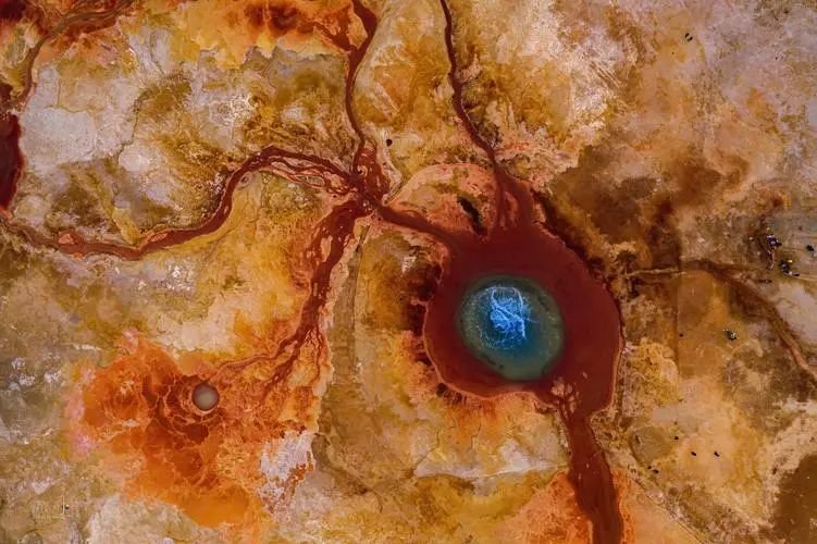 艾肯泉泉眼直径约10米,泉水沸腾,不断翻滚上涌,周围深红、橘黄色硫磺矿物长期沉淀。从空中俯瞰宛如一个奇特的瞳孔,一只镶嵌在大地上的鬼魅独眼,故此得名。