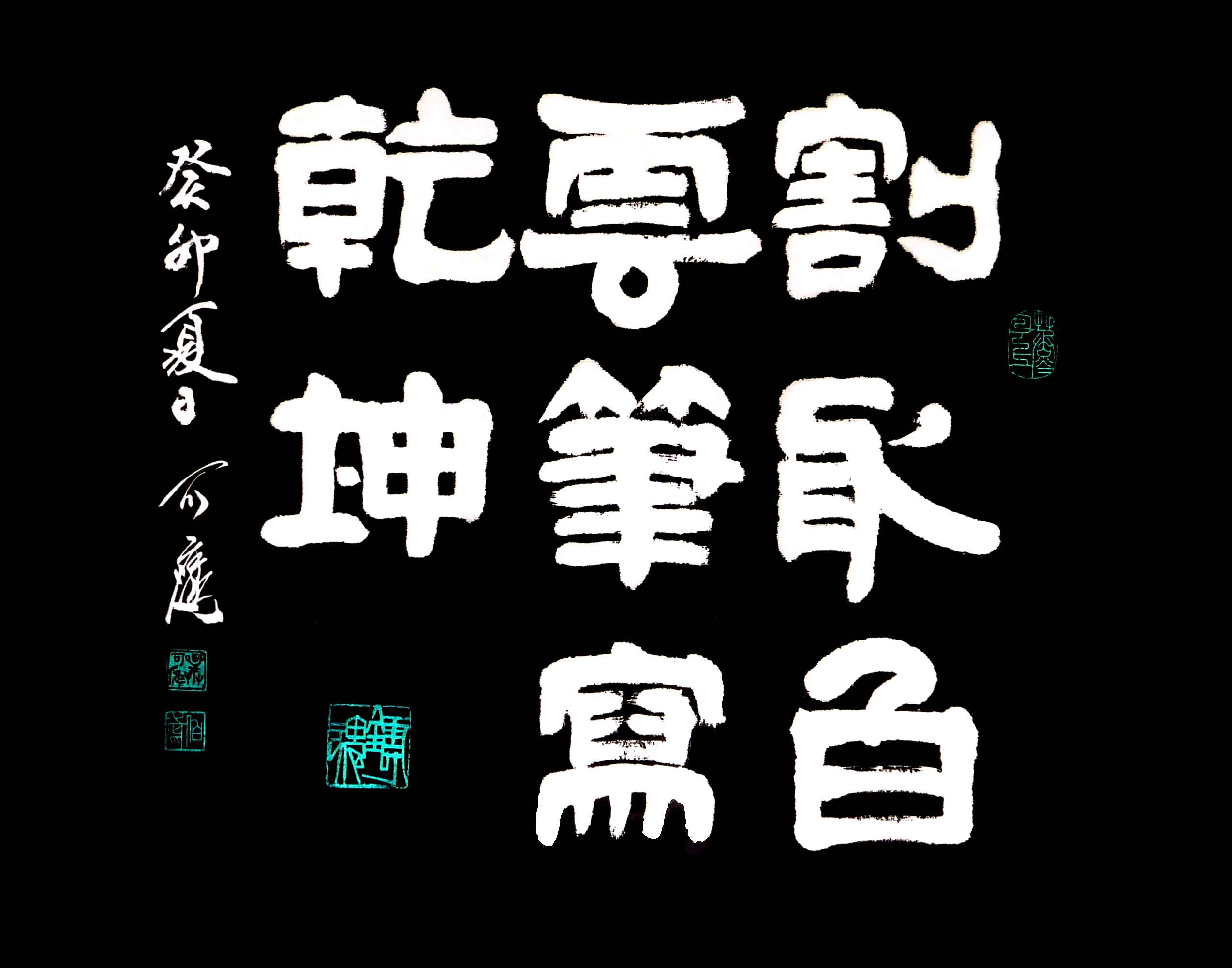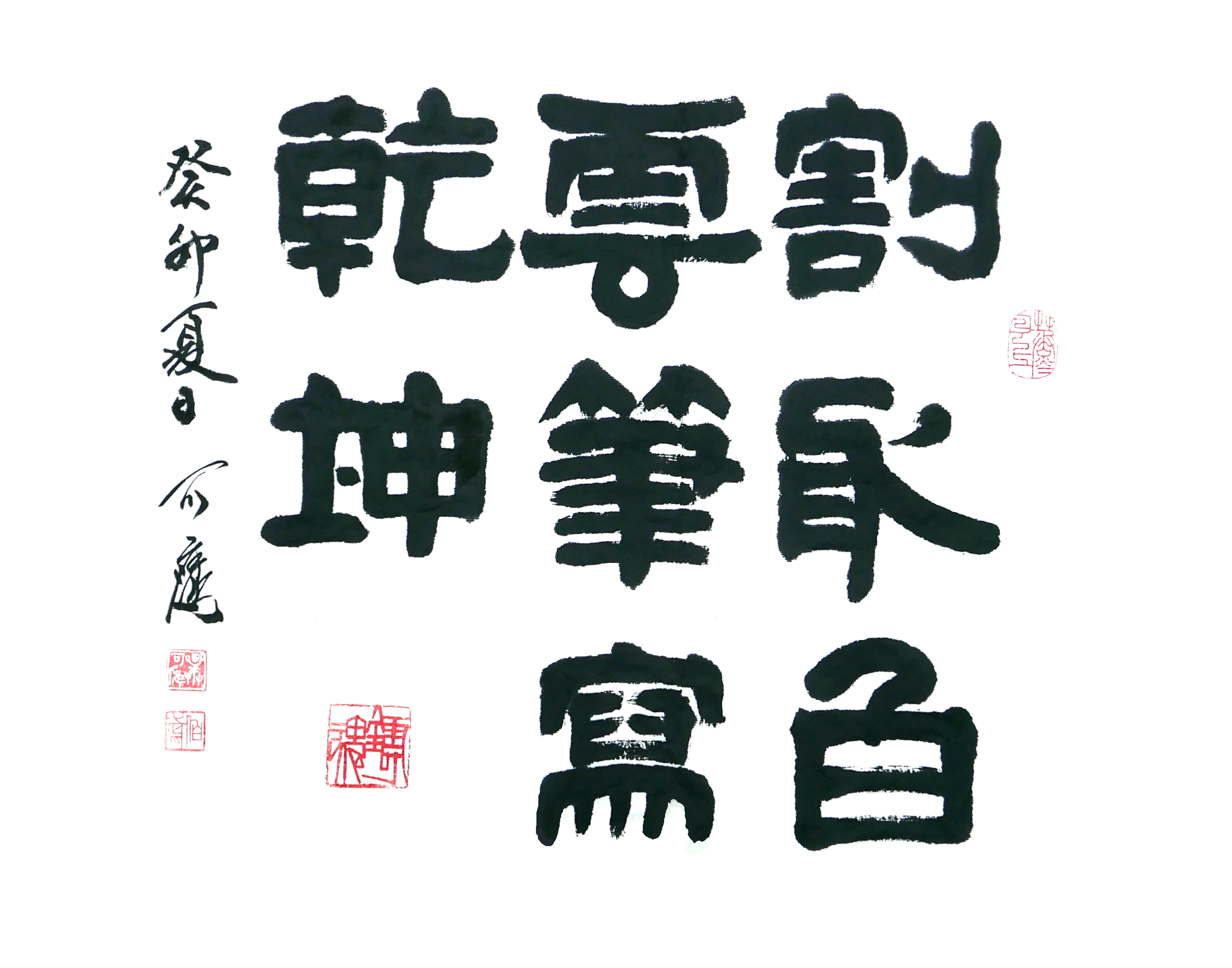 “割取白云,笔写乾坤。”一共十个字,我在许多字里融入了篆书的艺术元素,不仅不难看,反而觉得很有生气。
