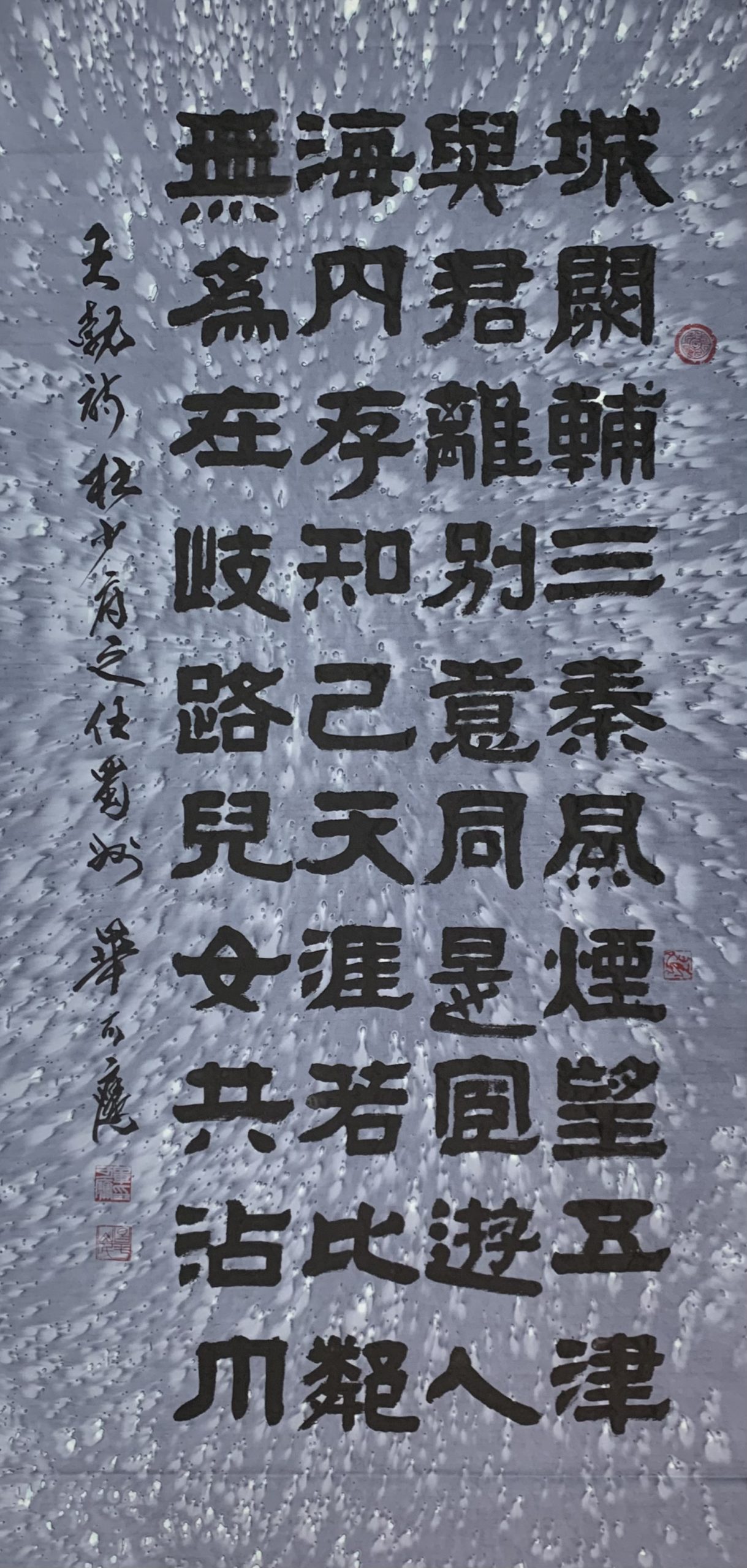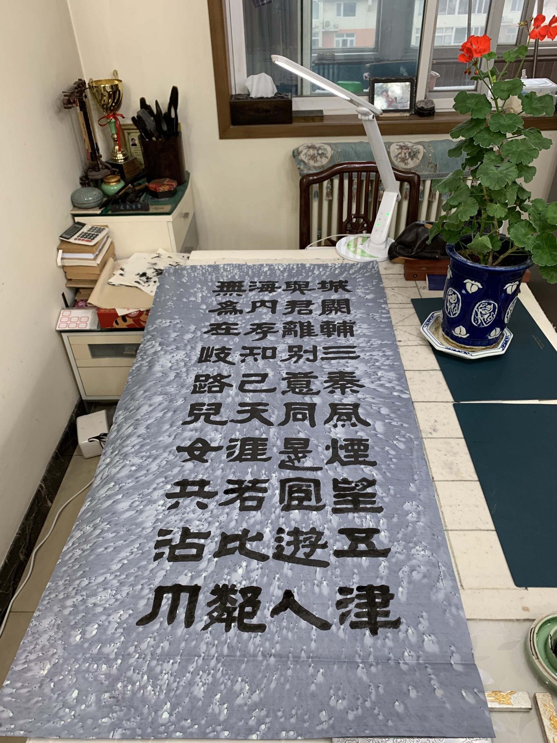 在绝版的四尺软普藍虎皮宣纸上书写王勃的五言律诗《杜少府之任蜀州》。