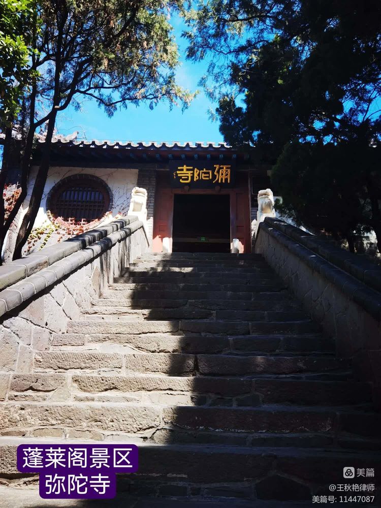 去往蓬莱阁方向有弥陀寺。一座清幽的小寺院,柏树森森,花儿绽放。正殿里供奉的是西方三圣,中间是阿弥陀佛,左为大势至菩萨,右为观世音菩萨。