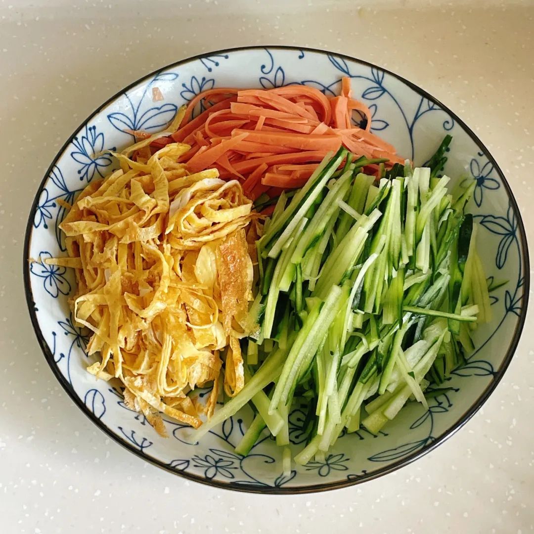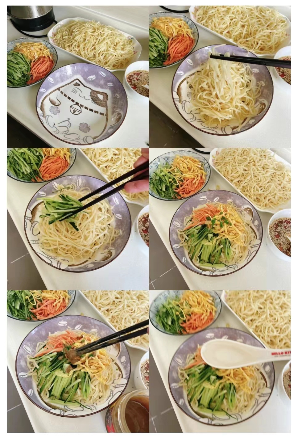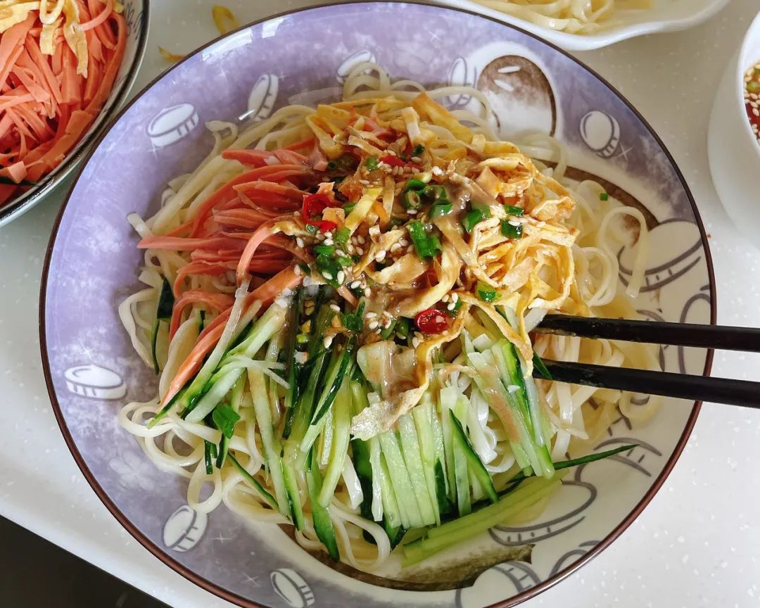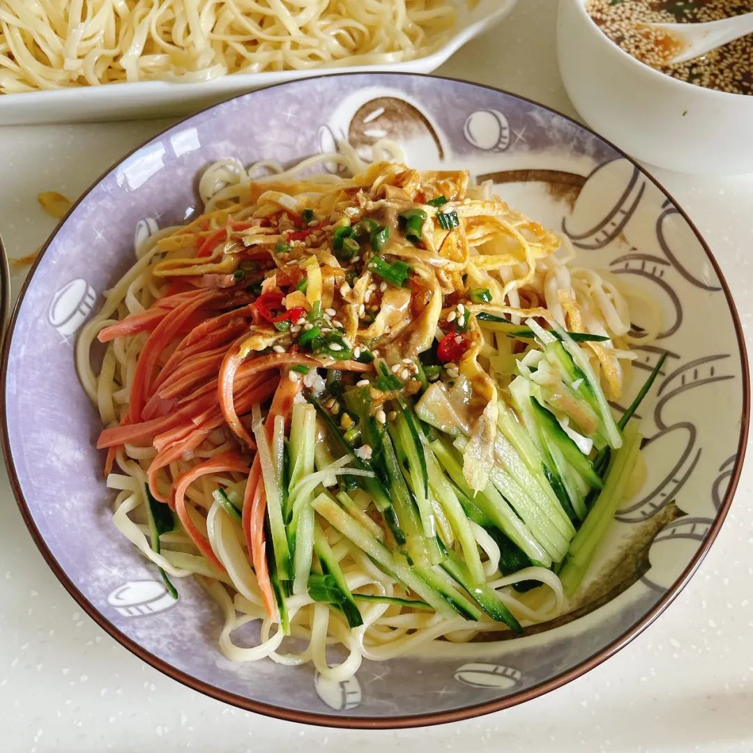 “夏季多少有些吃不下,来份凉面,简简单单清凉开胃。什么主食、蔬菜、荤菜、蛋白质都配上一点,多好~”