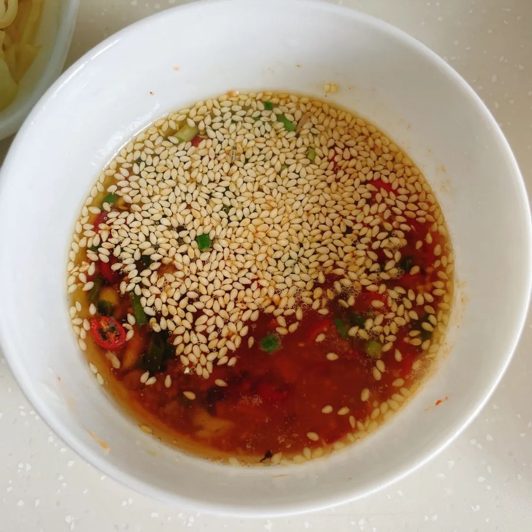 [4] 拌面汁的配方:2瓣蒜导成蒜泥、2-3个小米辣切碎(不吃辣可以少放或着不放)、1根小葱切花、1小勺芝麻,然后烧2汤勺热油浇进去。然后依次加入1/5小勺鸡精、3汤勺生抽、2/3汤勺醋、1/2小勺花椒油、1/2小勺红油、1/2香油、1/4小勺糖,搅和搅和备用。