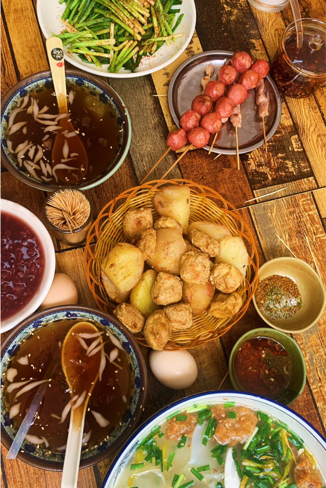 豆油皮韭菜汤、砂锅鱼、薄荷煮鸡蛋……