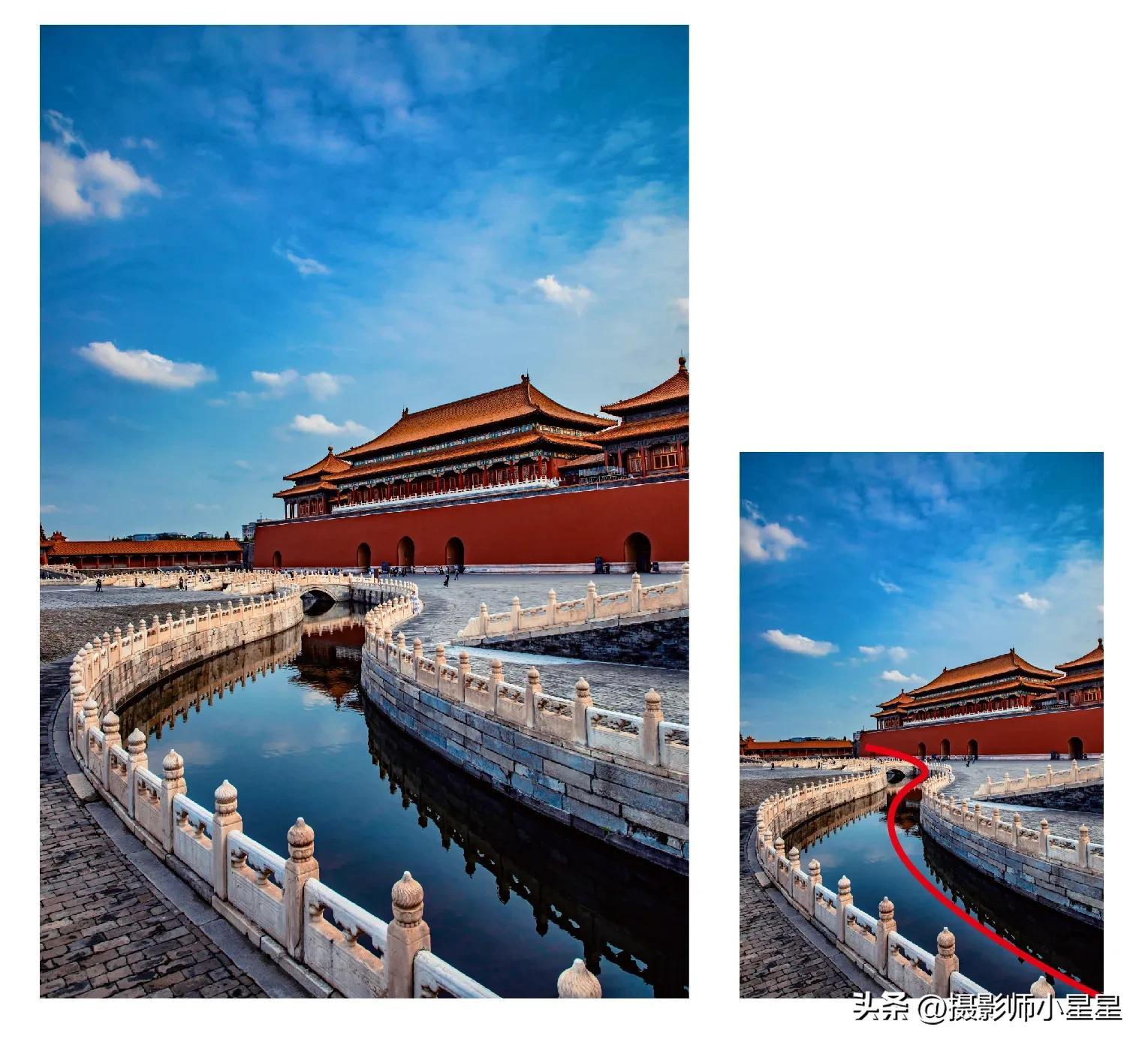 如上面这张拍摄于故宫的照片,其左右并不一样,但视觉上感觉是均衡的。