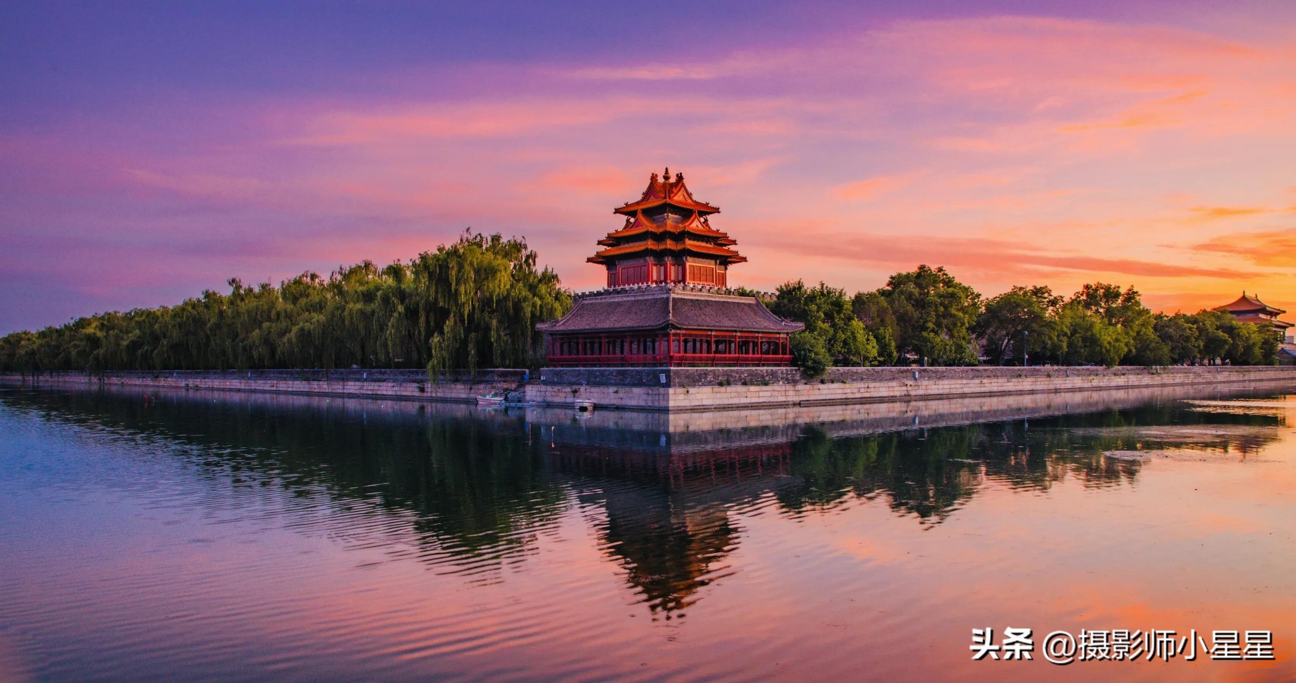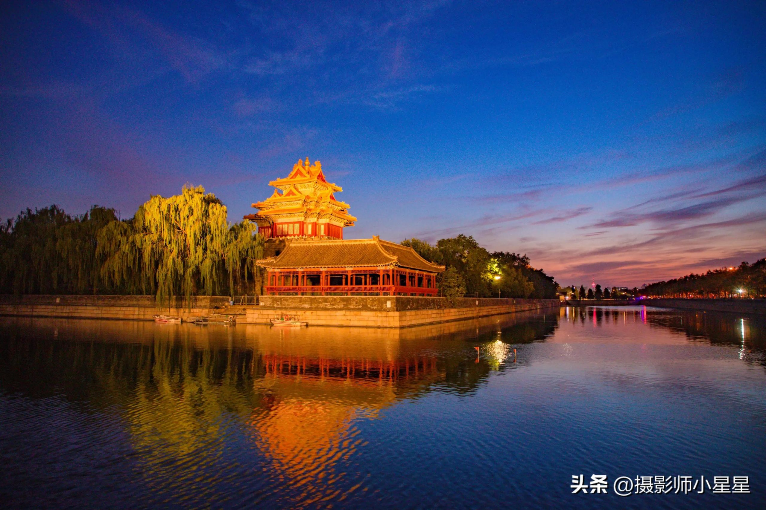 如上面这张拍摄于故宫角楼的照片,水面大致在三分线上,而角楼建筑大致在三分九宫格的趣味点上,更能吸引人们的视线。