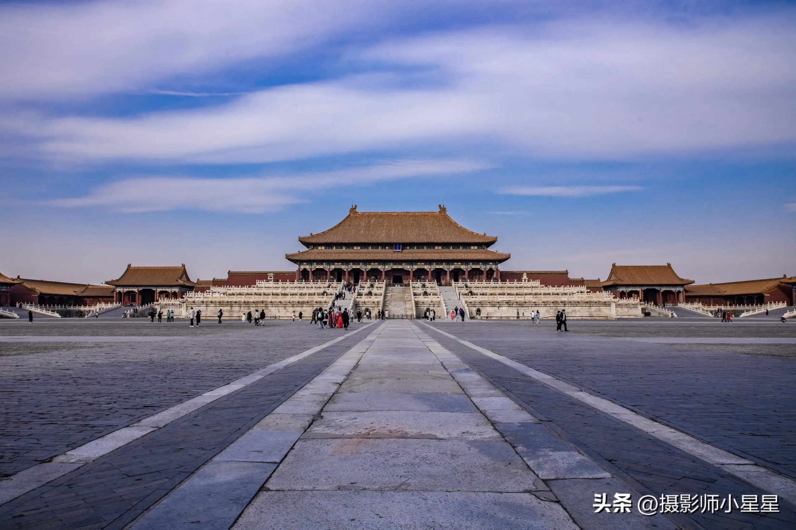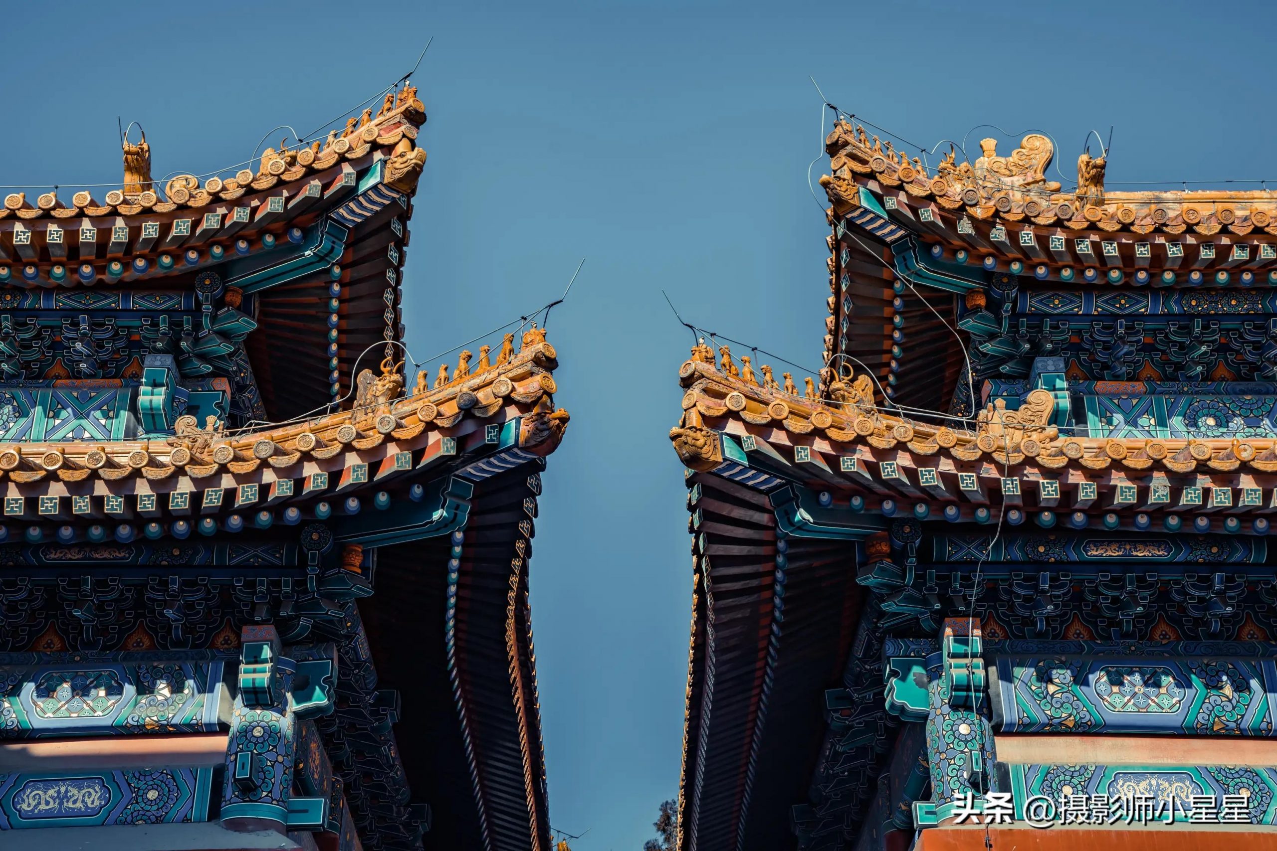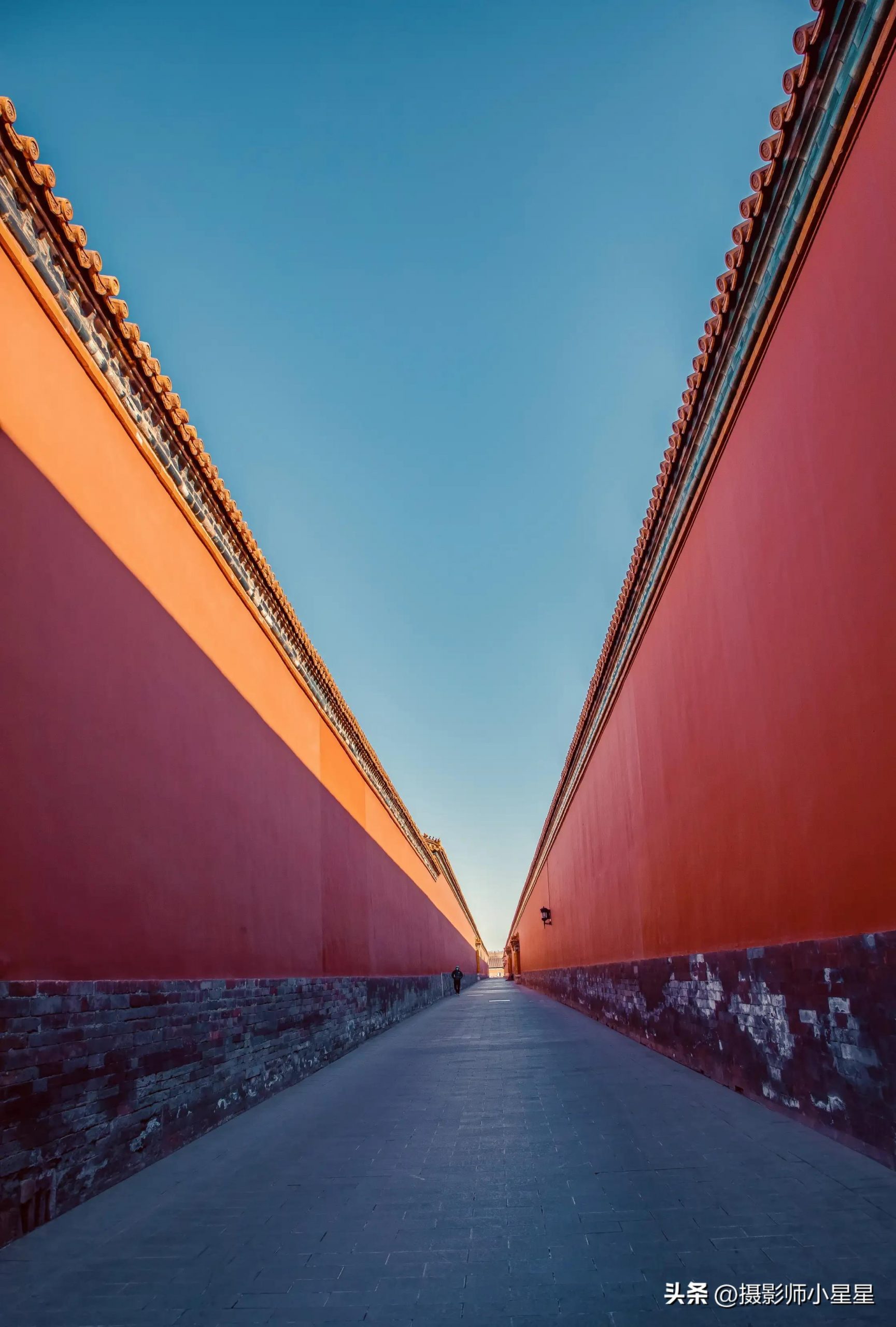 你看,如上面这张笔者拍摄于故宫的照片,当我们采用对角线构图拍摄建筑,在画面中其线条能够得到极大的延伸。