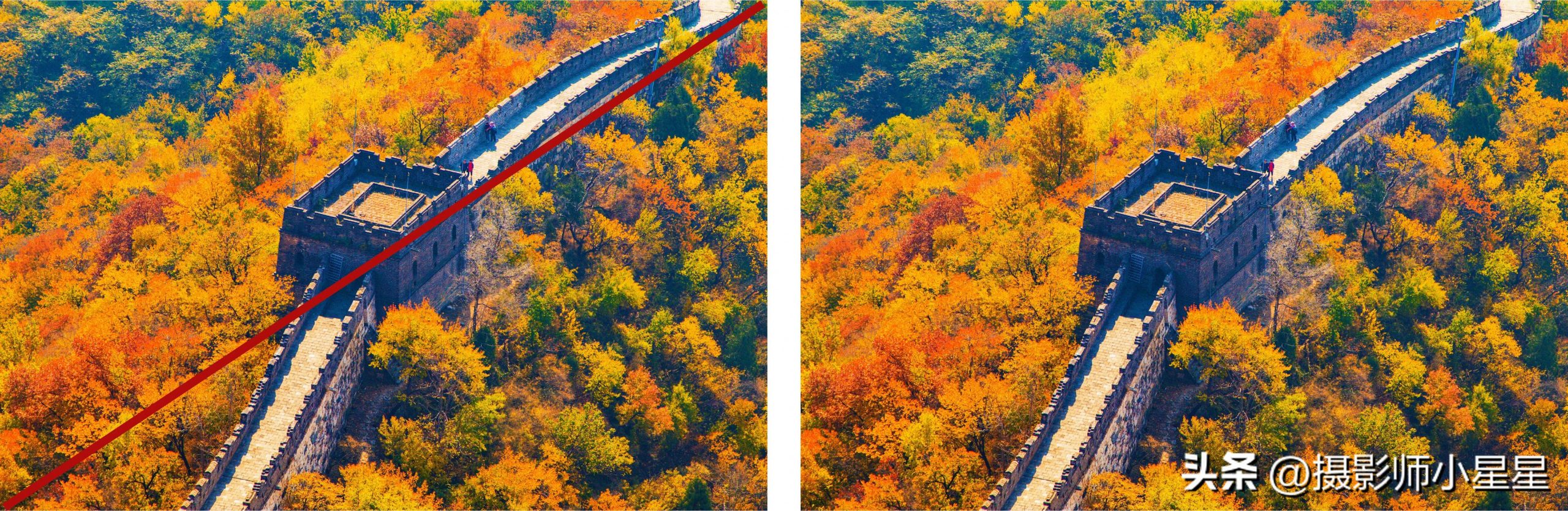 在使用三分线构图法时,我们只需把照片从水平或垂直方向划分3条线,把目标放线上便可以了。
