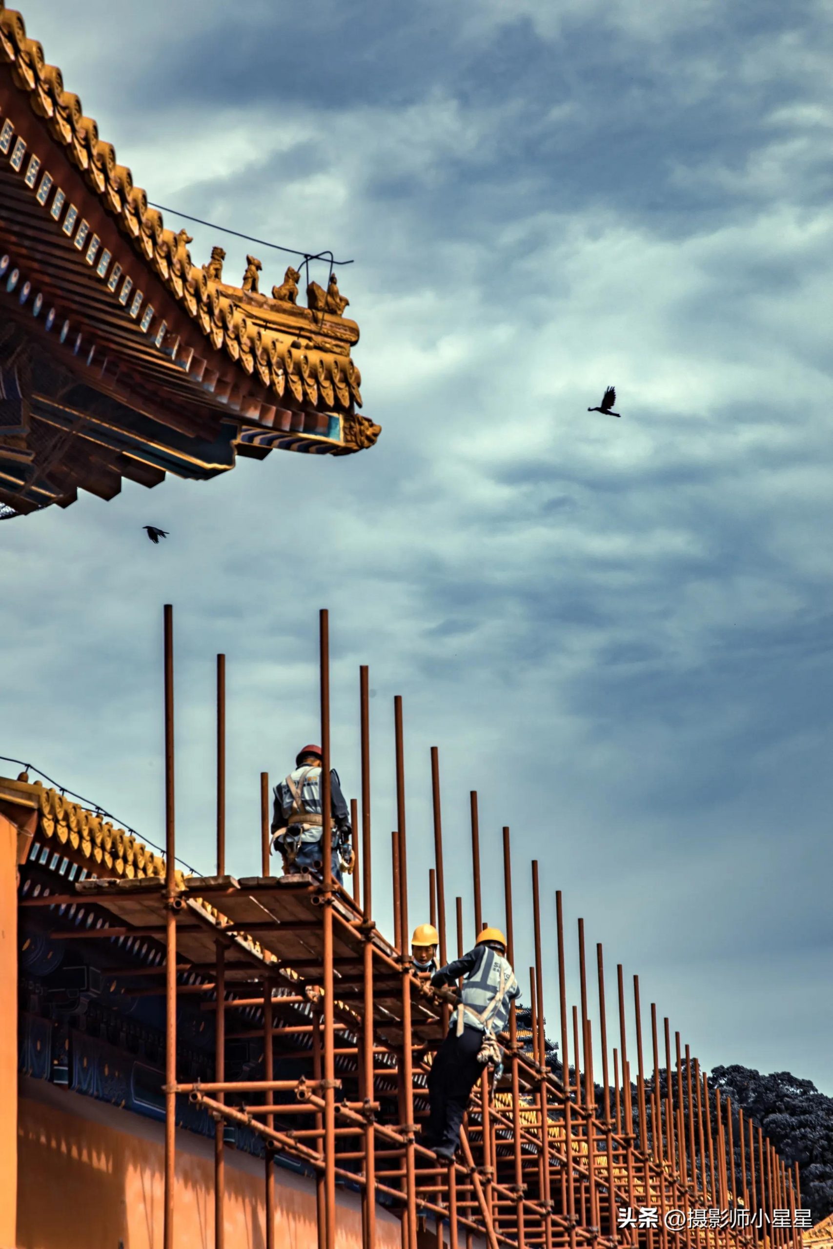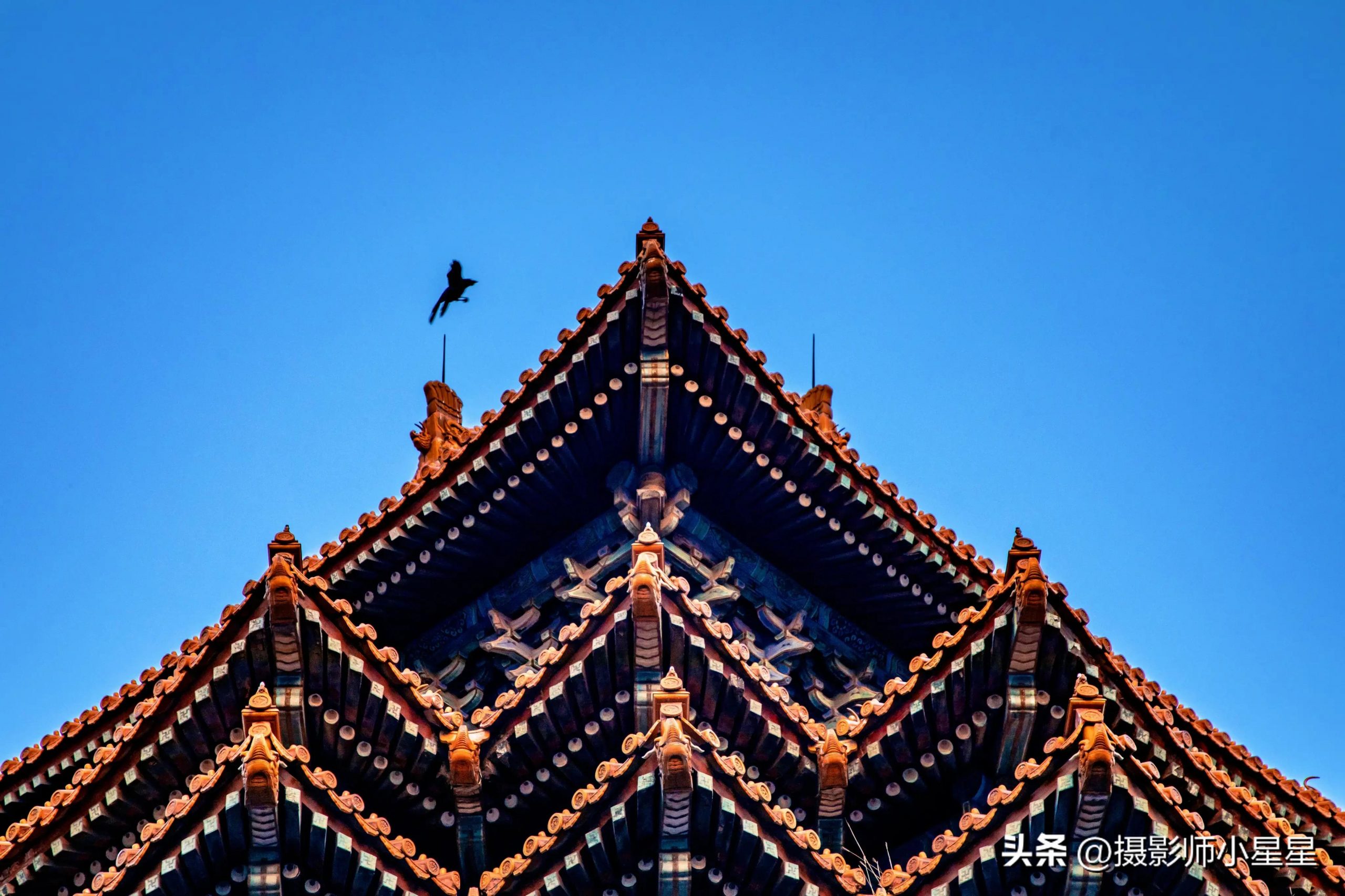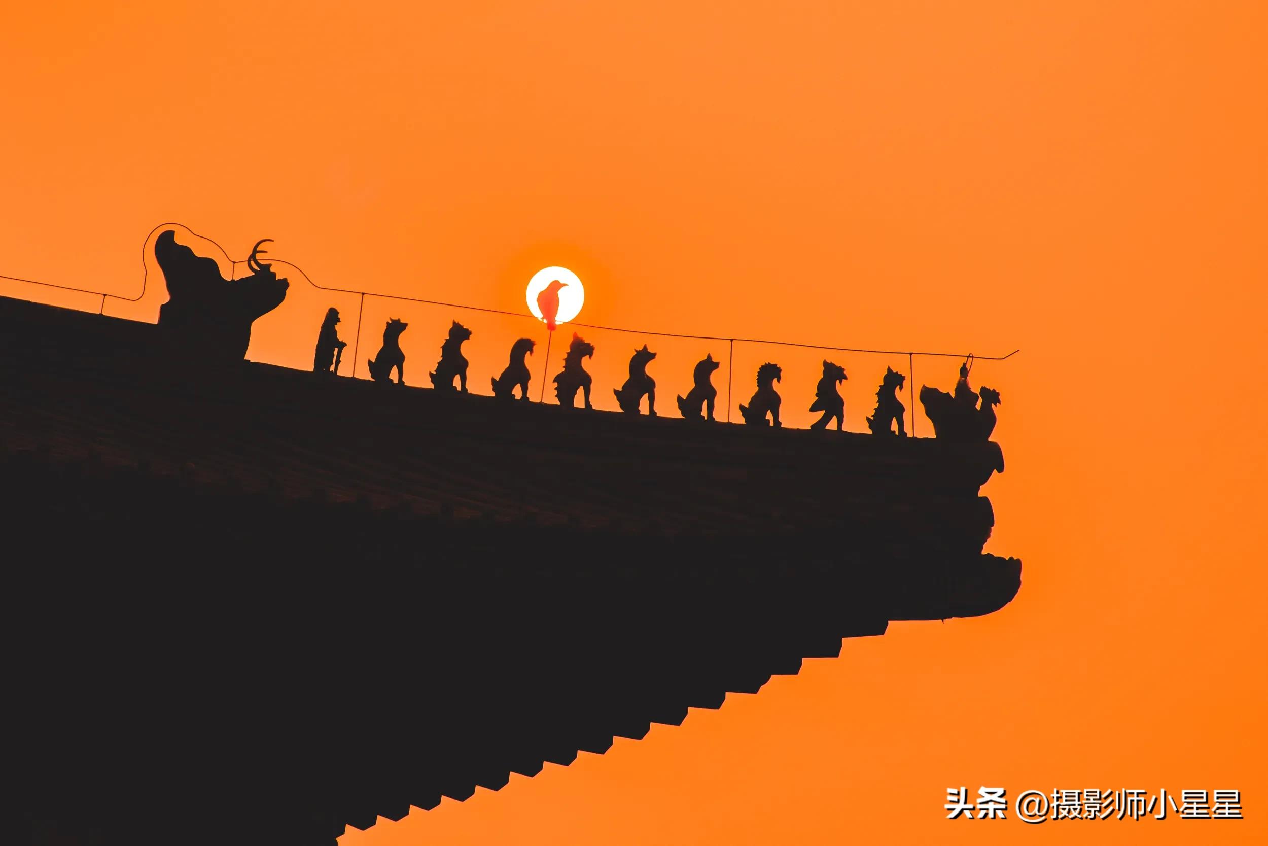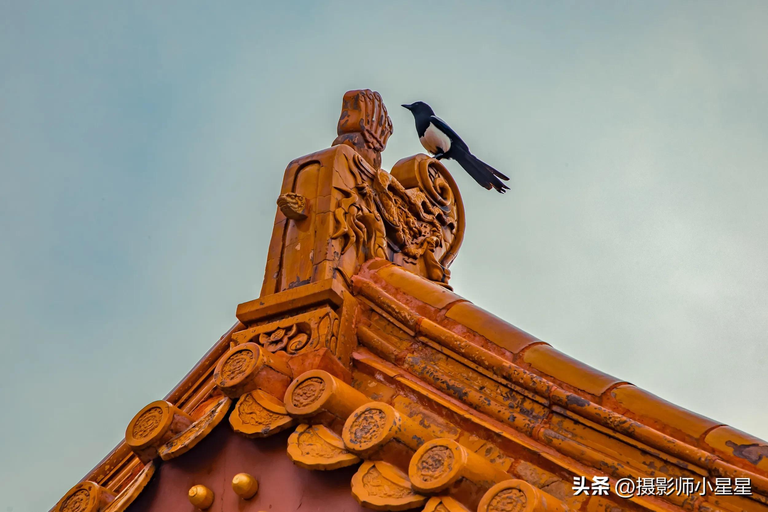 如上面这些笔者拍摄于故宫的照片,在拍摄建筑的过程中,我们可以通过寻找建筑中的点和线条,找出画面中的三角形元素,让建筑结构大致呈现三角形,而画面中的鸟增添了画面的趣味。