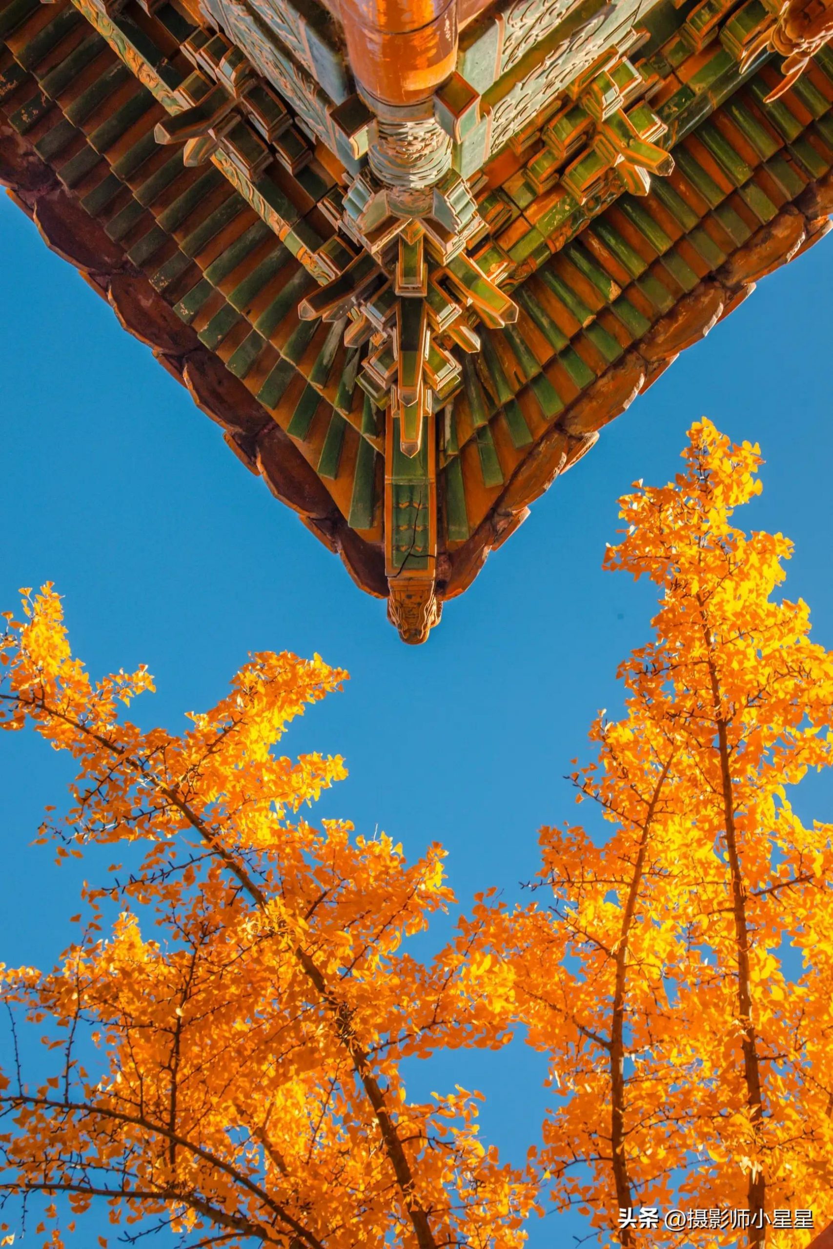 除了正面的三角形构图,三角构图其实也可以倒过来使用,比如拍摄古建筑漂亮的屋顶等,倒三角给人一种不稳定、有动感的感觉。