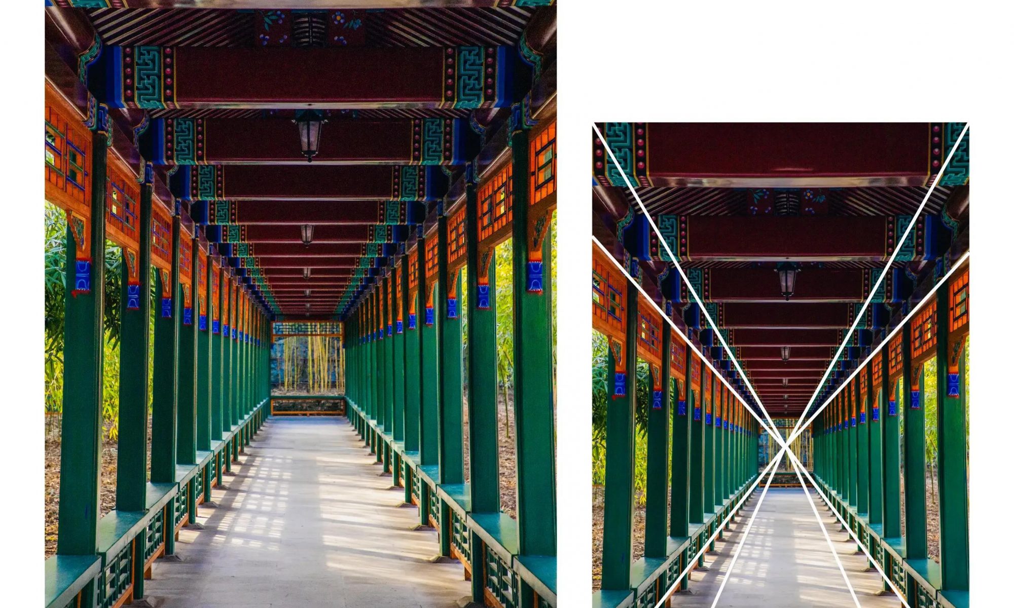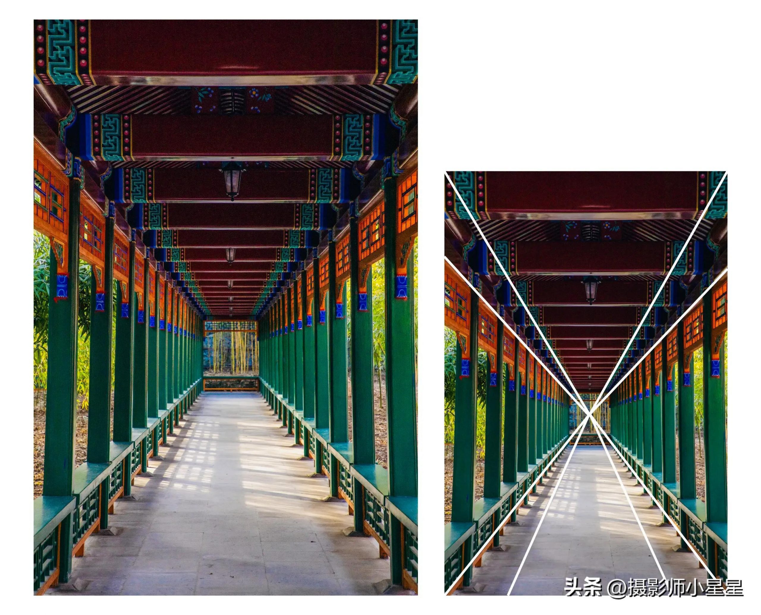 如上面这张笔者拍摄于颐和园的照片,很多建筑中都隐藏着斜线线条,例如柱子、楼梯、框架等,我们可以从一侧拍摄建筑的渐变效果,这样的对角线构图可以使画面更具延伸感、空间感,能够展现建筑的节奏美感,同时具有引导视线的作用。