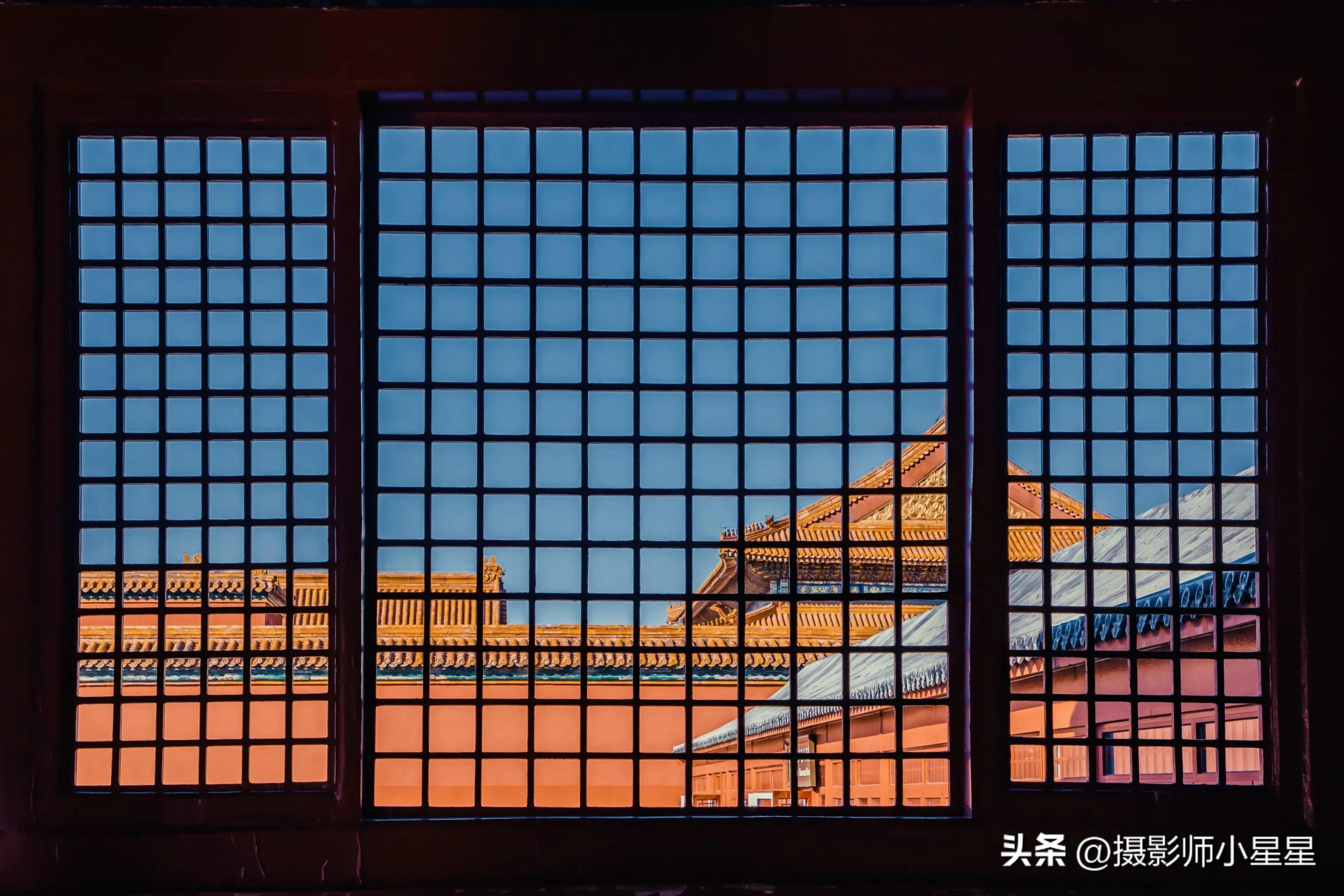 我们从室内拍摄户外的建筑时,还可以将窗户作为框架,例如上面这张拍摄于故宫的照片,用窗户的框架拍摄室外的建筑,能够形成画中有画的效果。