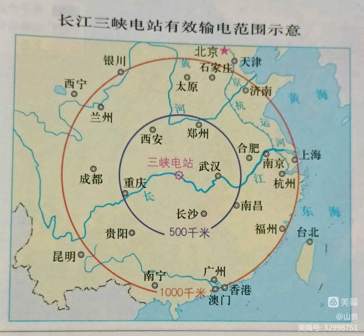 2006年版高中地理课本中关于三峡电站供电范围示意图