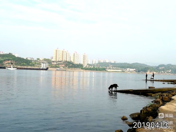 宜昌市区早晨带家犬钓鱼的市民