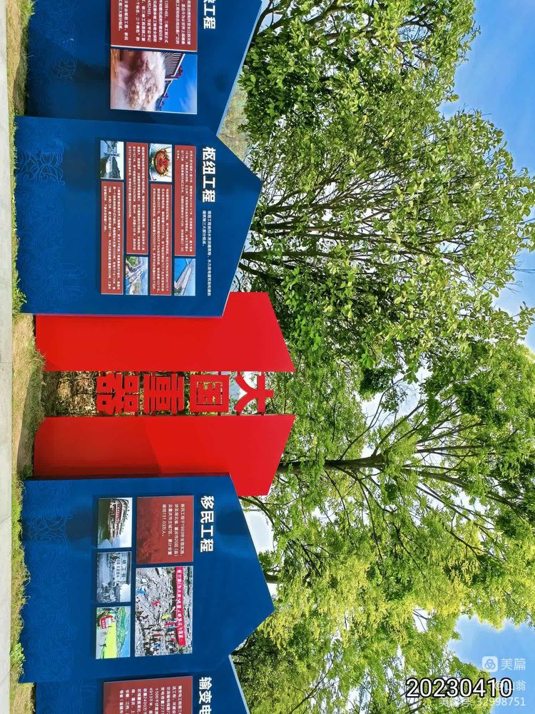 走出展厅,导游予大家充足的观览时间,可以尽情多方位地观察大坝。大坝的绝大部分都已静坐于平如明镜的水下,但我们周围精心排布的各色花木,却也令人赏心悦目。水库有关展版却引不起大多游客的注意,我则有意识走近它们拍下“大国重器”一张,当然也不忘拍下一入目就令人心悦的花木。之后,大家终于走近最能靠近大坝的地方,但不能登临大坝,只能在一处观景台上拍下几张大坝的照片。