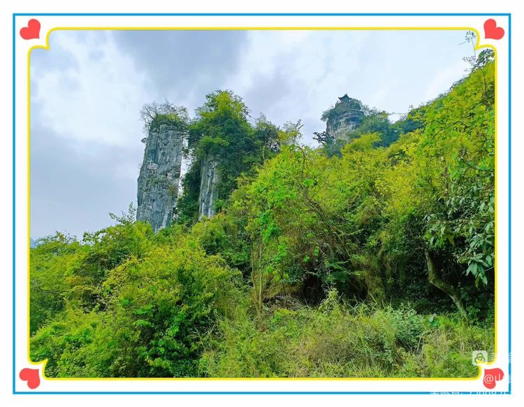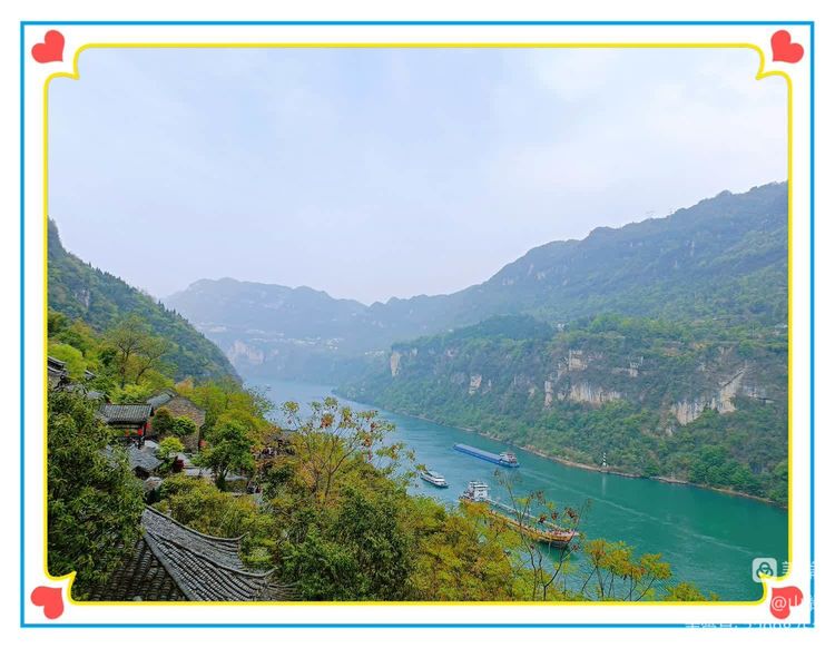 三峡人家景区长江两岸翠峰如簇,奇峰突起,右则峰上的小亭名为“邀月亭”