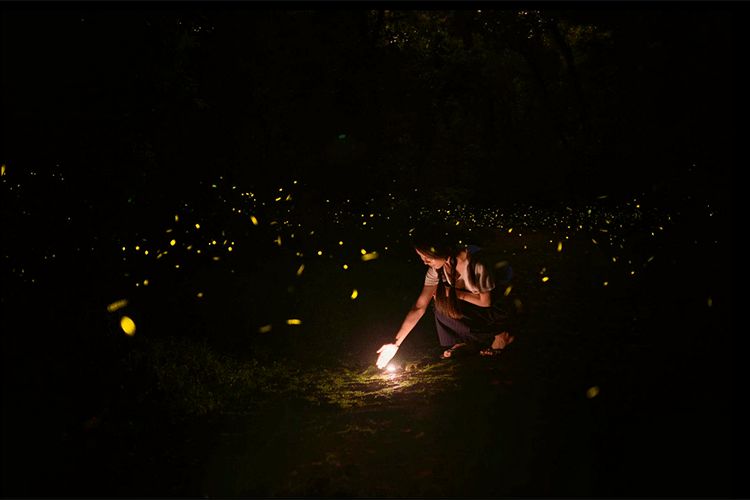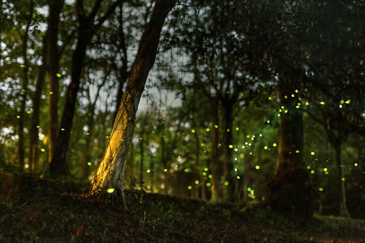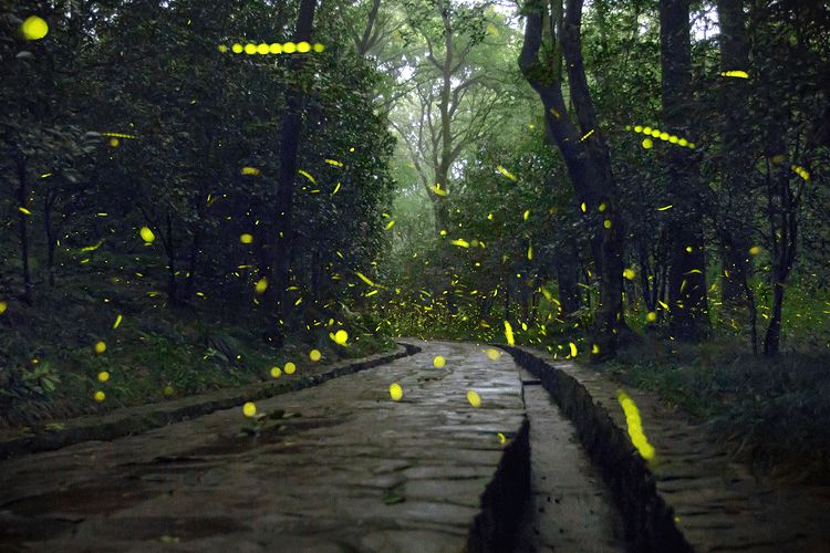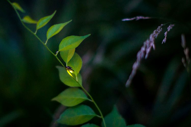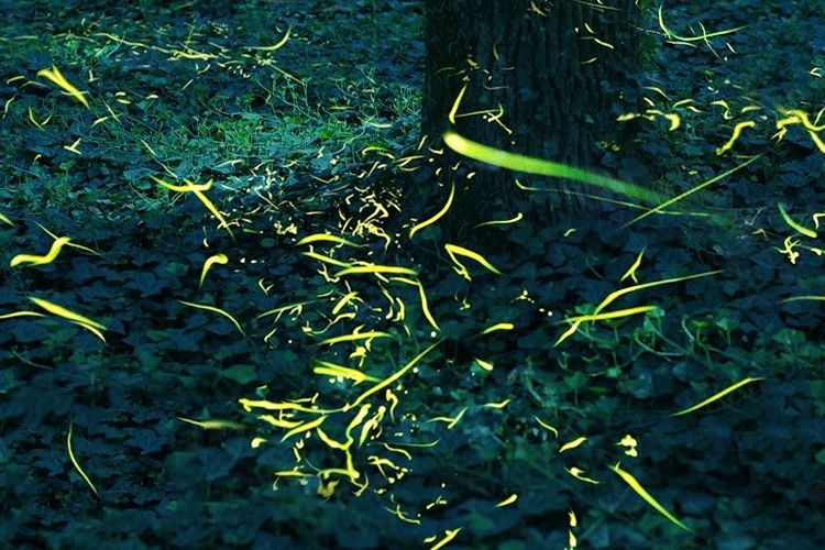 每当一只萤火虫发光时,就会有数只同伴在它或近或远处同步闪烁,像是被设定好的霓虹灯带,有节奏地亮起,又暗下,暗下,又亮起,形成了一种遥远但又确定的信号。