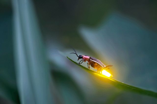 幼时曾捉过萤火虫放进被子里观察:环境甫一暗下来,萤火虫并没有闪烁,要等到三五秒之后,尾部两侧才开始闪出微弱的光点,而后逐渐变亮,连成细细长长一条,越来越亮。随着呼吸的起伏,时强时弱,时明时暗,像数着节拍似的。