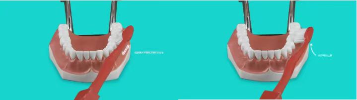 接着刷上下排牙齿的内侧面(即贴近舌头的那面)。前牙区牙刷竖放,后牙区同样把牙刷向牙根方向倾斜45度,放在牙龈边缘的位置,轻压,让刷毛进入龈沟。