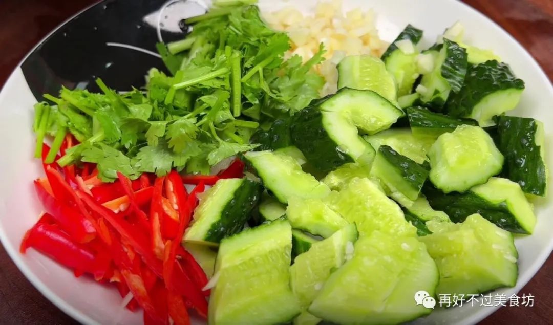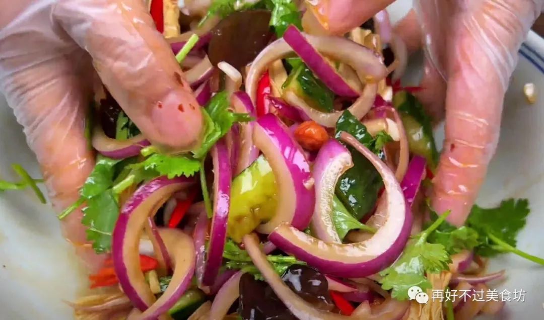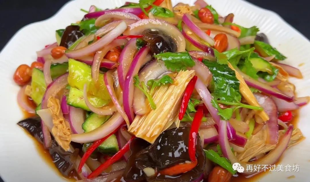 主要食材:紫色洋葱、黄瓜、大蒜、小米椒、香菜、腐竹、木耳、花生米