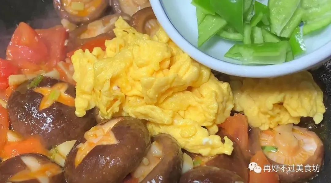 9、等西红柿炒出汁水后,把香菇也加进来,开大火快速翻炒均匀,之后,再把鸡蛋、青椒也加进来,继续开大火翻炒均匀。